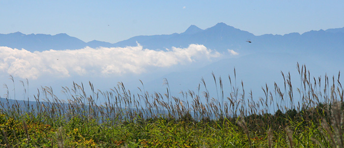 が少し見かける程度である。ススキもなんとなく元気がない。今年は猛暑のせいか、花も不作であったろうか。折角来たのですずらん峠への道を見送って、ヒュッテ アルビレオを経て八子ケ峰東峰に向う。左を見ると、ススキの原の向こうに