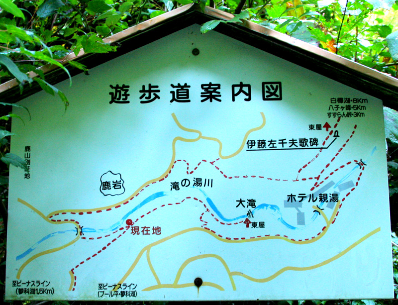 別荘地を道なりに行くと、見えぬ渓谷の瀬音を聞きながら雑木林を下ってゆくようになる。やがて下に記す遊歩道マップの立つ分岐に至る。 左後ろへの道を見送ってまっすぐ行くと、