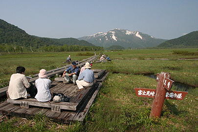 -- 尾瀬ヶ原 -- ![]() << 写 真 集 >> 尾瀬ヶ原(05-06-19歩く) 前日、玉原高原の鹿俣山に登った。 今まで沼田周辺の山としては、玉原の尼ガ禿山、武尊山に登っているが、尾瀬の片品村まで直ぐなのに尾瀬を訪ねていなかった。 尾瀬というと水芭蕉、水芭蕉の花が咲く頃の5月下旬から6月上旬は特に混むので敬遠していた。 ところが今年は雪が多く、6月中旬も過ぎようとしているのにまだ水芭蕉が残っているというのを友人から情報を得て、急遽行ってみた。 前日に尾瀬の山小屋に入ってしまう案もあるが、温泉に入ってゆったりしたいと思って、片品村の隣の川場村のSLホテルに 泊まった。昨年の情報であるが、インターネットで調べると戸倉から鳩町峠へのバスの始発は4:30とある。できるだけ混まないうちに 尾瀬ヶ原を廻ってしまおうと朝食抜きで、4:00にホテルを出発した。戸倉の並木駐車場には4:50に着いた。どういう理由かわからないが、 今年はゲートが開くのが5:00で、バスも5:00頃が始発であった。バスはマイクロバスで、人数がまとまると出発するものであった。 車の駐車料金は一日1000円で、マイクロバスは大人片道900円であった。 その日のうちに神奈川県の湘南の自宅に戻らねばならないので 、昼ごろには鳩待峠に戻って来ることで地図を見て次のようにコースと時間を設定した。 鳩待峠→(1:00)→山ノ鼻(1:00)→(0:45)→中田代三叉路(1:45) →(0:30)→竜宮十字路(2:15)→(0:30)→ヨッピ橋(2:45)→(0:40)→中田代三叉路(3:25)→(0:45)→山ノ鼻(4:10)→(1:20)→鳩待峠(5:30) 兎に角、木道を歩くだけであるので、迷いようがない。コースガイドは省略し、写真をスライドショーとしてまとめたので、ご覧ください。 (コースタイム) 川場村SLホテル4:00==戸倉4:50〜5:06==鳩待峠5:25〜30−山ノ鼻6:30〜38−中田代三叉路7:32−竜宮十字路8:13〜20−ヨッピ橋8:45〜55− 中田代三叉路9:34〜9:42−山ノ鼻10:15〜41−鳩待峠11:34==戸倉11:55〜12:05==(関越沼田IC・圏央道あきる野IC・八王子・橋本・厚木)==自宅18:00頃 (地図) ・昭文社 山と高原地図 「尾 瀬」 |