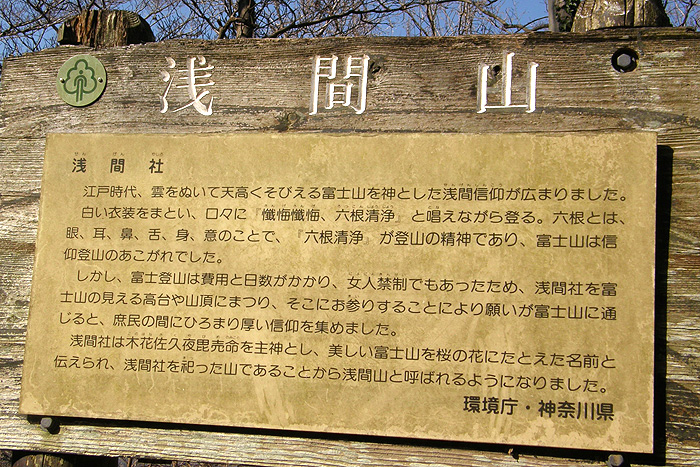 | 高麗山、浅間山、湘南平の尾根道を縦走し西小磯へ下る ('08-02-21) 湘南平は桜の名所である(見ごろ3/下旬〜4/上旬)。桜の時期は車で上ったことはあるが、高麗山、浅間山、湘南平の尾根コース は自宅から近く、いつでも行けるという気持から歩いたことがなかった。大分、近場も歩き尽くしてきたので、今回、桜のときの下見も兼ねて歩いてみた。 当初は大磯駅→高来神社→高麗山→浅間山→湘南平→楊谷寺谷戸横穴群→大磯駅というつもりであったが、連れが、 確か、以前ウオーキングで湘南平駐車場付近から西の方に尾根伝いに歩いたことがある、と漠然としたことを言い出したので、そんな道があるだろうかと 確かめに行ってついつい尾根伝いに西小磯まで歩いてしまった。そして、帰ってきてからインターネットで調べたところ、そこは平塚市の湘南平 ハイキングコース案内の赤坂・湘南平コースであった。 大磯で降りて、線路沿いの道を東側に行く。5分も歩くと、東海道線をトンネルでくぐっている広い道に突き当たる。ここを左に行ってトンネ ルをくぐり、すぐ高麗山・湘南平丘陵に平行している右の車道に入る。後は左の丘陵から近かず離れずしながら道なりに行く。約30分弱歩くと 丁字路となるが、右に曲がり、すぐまた左に曲がって行くと、国道1号線の化粧坂交差点に出る。そして少し国道1号線を進むと高来神社入口となる。 鳥居をくぐり石段を登って行くと白梅の咲く高来神社に至った。近くにはトイレもある。 神社の後ろがハイキングのスタート地点である。左男坂、右女坂である。これをどちらから行くか迷うところである。高来神社、高麗山、八俵山にかけて 一帯が「神奈川県指定文化財 大磯高麗山の自然林」で天然記念物になっている。この常緑広葉樹の森を十分見るなら廻り道する女坂がいい。 急ぐなら急な男坂、というところと思う。時間も十分ある、ここは女坂を行くことにする。 空を覆う常緑広葉樹の大木のトンネル道を 大きくジグザクと登って行く。ヤブツバキが所々に咲いていたり、少し開けて大磯の光る海が覗いたりしている。大磯高麗山自然林の案内板によると 高麗山はスタジイータブ林によって覆われ、林床には伊豆と九州の海岸にしか生えていない珍しいモクレイシが生育しているとのことである。 また、高麗山の由来は、奈良時代のころ朝鮮の高句麗が滅ぼされ、その王族の一人である高麗若光が一族を引き連れて海を渡り逃れ、この地に住み着いたことから高麗と呼ばれるようになったということである。 15分も登ると男坂と合流し、さらにひと登りすると石段となり、緑のトンネルの先きに冬枯れの大木が見えてきて、高麗山の広場にでる。ここは奥社があったところとのことである。 見晴らしも効かない、高麗山の由来の看板を読んで、左(西の方)の道を行く。下に下るような道と尾根沿いの少し登る道の二本あり、どちらかな、と迷った。尾根沿いが間違いないと思って 上の方の道を行く。少し登って石の多い道を下って行くと、もう一本の道と交わった。もう一本の山道は巻き道のようである。 立派な木の橋を二回も渡ると、やがて八俵山につく。ここから、植生ががらりと変わる感じで、常緑広葉樹の森は見納めとなり、その行く先はコナラなど落葉広葉樹の冬枯れの林立である。 そして、梢越しに湘南平の朱色のテレビ塔が見えてくる。下るコナラ林で明るくなった山道の足元にはところどころ水仙が咲いている。そして下った鞍部は地獄沢への分岐になっている。 ここは道標にしたがって真っ直ぐ登り返して行く。5分弱上ると平坦な道となり、古い字の消えかかった浅間山の案内板が出てくるが、 浅間山の三角点の場所でない。 さらに行くと右側がロープで囲われた彼岸花群生地となる。今は水仙の花の群落が代わりを務めてくれている。 ここら辺から落葉樹の大木にところどころ名札がついている。冬枯れの木々は何でも同じに見えてしまう。これはありがたい、と確認しながら行く。 ケヤキ、ハリギリ、ミズキ、エノキ、ヤマグワ、クヌギ、コナラ・・・などがあった。やがて常緑広葉樹が多くなると、三角点のある浅間山(せんげんやま)に到着した。 浅間山という名前の山はアチコチにある。その由来の看板がたっていた(参考のために下に掲載しました)。 それを読んだ後、常緑広葉樹の道を下ってゆくと「高田公園・楊谷寺谷戸横穴群」分岐となる。帰りはここを 下る予定であるので良く確認して行く。そして少し登り返し、右斜めに桜並木の階段道を登って行くと湘南平のアンテナ塔に着いた。 何回も上がっているがアンテナ塔に登ってみる。丹沢の山々や、煌く湘南の海の向こうに江ノ島が見える。丹沢は先だっての雪が残っていて、いつもより凛々しく見える。 富士山も見えたと思ったが、桜の木々に遮られてはっきりしない。いつも見ているので見なくてもよいわけであるが、 汗流して登ってきた湘南平、折角なので西側のレスト