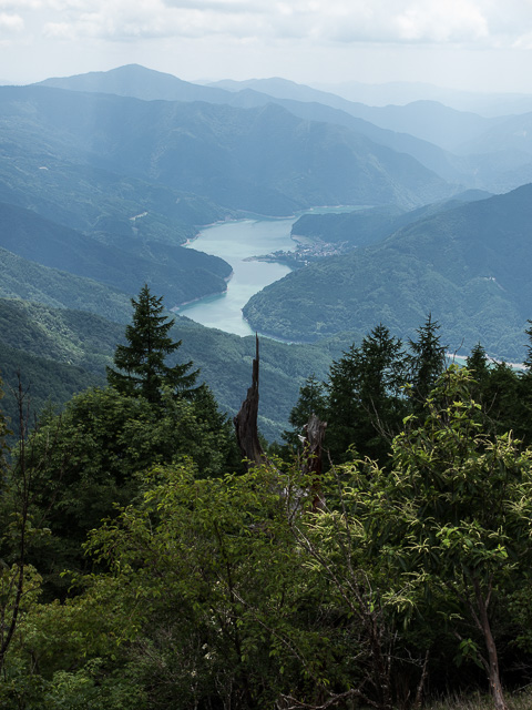 今までの道は樹林帯であったが、小笹で覆われた原や尾根に灌木の立つ道で、植生が変わったようである。展望の良いところでは、眼下にイワガラミの花が咲き、ブルーの井川ダム