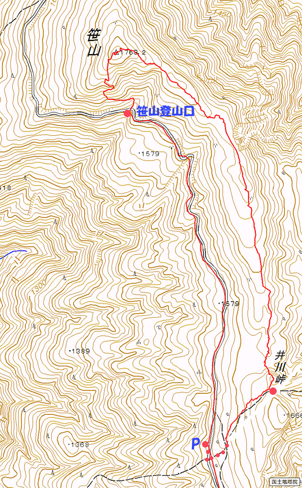 丁度いい。林道と笹山の標高差は150m位で約30分で登れるようである。しかし、それだけでは少し物足りないので、県民の森の端の井川峠から尾根伝いに笹山に登ってみることにした。