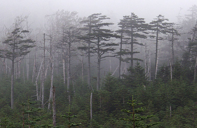麦草峠を起点に周回しました(04-09-11歩く) 麦草峠には何度となく足を運んでいるが、何故か縞枯山には登っていなかった。 今は秋の花が終わり、紅葉までの端境期である。こういう時期、縞枯れの写真を写すのも良いかもしれないと思って登ってみることにした。 自宅を4:00頃出発して麦草峠の駐車場についたのは8:00頃である。茅野市のピンポイント天気予報では午前中は曇りがちで昼には青空が 出るようであるので、自宅を出るときは小雨がぱらついていたが、安心して身支度して出発する。 縞枯の方へ入って、すぐ右への雨池への木道を見送ると、見事な鬱蒼としたシラビソ、コメツガの大木の森の中に入ってゆく。 麦草峠から足の向くのはいつもヒユッテの方であったので、この辺は草原というイメージが強い。そのため、こんな見事な森がこんなに早く 出現するとは予想もしなかった。急遽カメラを出して樹の写真を写しながら進んでゆく。 道はおおきな石のごろごろした歩きにくい道である。 そのうち木道になるが、それもつかのま相変わらずおおきな石のごろごろ道である。この歩きずらい道を道草しながら30分も行くと 三叉路の峠らしくない大石峠に着く。それからもうんざりする石の道を登ってゆく。勾配がきつくなりダケカンバの幼木が多くなると山道の上の空に標柱が 見えてきて、岩場の展望台中小場に着く。 今までの樹林帯から開放され気分爽快である。正面をみると眼下の樹冠の連なりの向こうに山頂がガスで覆われた茶臼山が横たわり、 時折ガスが切れて縞枯れ模様を見せたりする。 右を見ると、時折ガスが流れ来て、高い枯れ木の林立を、覆い隠したり、霞ませたりして 幻想的な風景を見せてくれる。しばらく写真を写した後、茶臼山へ向けて出発する。また、大きな石のごろごろする道をわずかに下り、やがて登りとなる。 急登しだすと、健在な木に、枝のない白い木肌の立ち木、斜めに傾いている木、倒木、などが幾重にも重なったガスに煙る森となる。 あぁ〜、これが縞枯れの現場なんだと、納得しながら登る。やがて、勾配も緩み、ぽっかりと樹林が開らかれた空間に でる。そこが茶臼山であった。縞枯山風景が写せるか期待したが、見晴らしはなにも効かない。しかし、往復8分で左側に展望台への道が あった。カメラだけを持って行ってみることにする。前方が200度位開け、晴れたら絶景と思われるが、残念ながら見えたのは白いガスのスクリーン だけであった。 茶臼山からは一旦下る。この縞枯山との鞍部付近は縞枯れがさらに進み世代交代の地域であった。林立するのは枯れ木のみである。林床には青々した 1m位の若木が一斉に育っている。ここで、ガスに煙る立ち枯れ風景を何枚か写し、今度は縞枯山に登って行く。 相変わらず大きな石の道である。ところどころにシャクナゲの木が見え出すと、世代交代はさらに進み、青い青いシラビソの若木の海に 枯れ木が散在している風景となる。やがて標識が現われ、山頂と思ったら展望台分岐であった。行っても展望は期待できそうないので そのまま先を急ぐことにする。 ここからは平坦な道である。すぐ標識が立ち三角点の標石のあるところに至るが、縞枯山とは書いていない。 さらに樹林の平坦地を進むと、左側が開けた尾根沿いの道となり、著しく枯れた立ち木、傾いた立ち木が多くなると、行く正面に道標が見え、 縞枯山と書いている。三角点と山頂は食い違うことはよくあるが、今回は道端に山頂の標識という感じであった。しかし、ここから雨池峠 へはすぐシラビソの薄暗い林の道を急降下するので、逆方向に登った場合はその標識は納得かもしれない。 40分ほど下ると樹間から縞枯れの 雨池山が見えてきて明るい雨池峠に至った。さらに、ここを右に石の多い道を30分も緩やかに下ると大河原林道に降り立つ。そこから20分で 雨池の西岸に着く。ここで昼食とする。春に来た時に比べると水は少ないが、シラビソ、ダケカンバなどの原生林に囲まれ、静かなたたずまいを 見せてくれる。 昼食後、時計回りで東岸の八柱山分岐に向かう。初めての道であるが樹林帯は見通しがきき明るく美しいし、道も明瞭であった。 八柱山分岐からは春歩いた見覚えの ある道である。東南岸から樹林の道を大河原林道に向かう。春来た時は木道は途中までで往生したが、今回は雨池まで完成されていて 快適に歩くことが出来た。林道を左に行くと麦草峠方面の標識があり、シラビソ、コメツガなどの原生林の中に入ってゆく。 この樹林帯の道は同じ様な風景で結構長い。だいぶ道草をしたが、1:50ほどかかってやっとアキアカネの飛び交う麦草峠の茶水池に着いて この日の山歩きを無事終えた。 自宅3:55==相模湖IC5:07==双葉SA5:55〜6:22==茅野IC7:05==麦草峠(P)7:45〜8:00 --大石峠8:30--中小場8:50〜9:03--茶臼山9:35〜45--五辻分岐10:05--天望台分岐10:25〜30--縞枯山三角点10:34 --縞枯山山頂標識10:45--雨池峠11:25〜11:30--林道11:55--雨池12:15〜40--雨池西岸13:00-