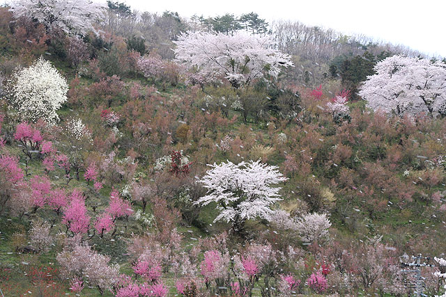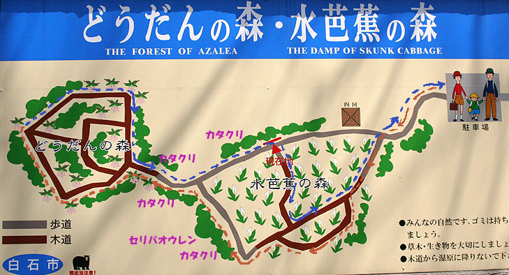 水芭蕉の森 ('05-04-19歩く) この時期、東北道を通って秋田の実家に帰るのが毎年の恒例になっている。今年は桜前線の歩みが遅くて、まだ仙台までしか北上していない。 秋田で桜を見るのはできそうもない。それでは途中、福島の花見山に寄ってみょうかと思ったが、混みそうである。 そこで、山の雑誌を調べて水芭蕉でも見てみようと、白石市の水芭蕉の森・どうたんの森に寄ってみることにした。 いつもは5時ごろ自宅を出るが、今回は4時出発とした。白石ICについたのは9:03であった。それから国立青少年野営場を目印に 国道457号線を行く。要所要所にこの時期だけの水芭蕉群生地方向を示す標識が立てられている。今、見ごろなんだ、と一安心する。 峠らしきところに登りきると広々とした牧場の向こうに白銀の蔵王の山並みが連なり、日本離れした雄大な風景が展開している。 標識に導かれて、国立青少年野営場方面と別れ、遠くに蔵王が望まれる森の道へと入ってゆく。やがて終点となり仮設トイレのある 広い駐車場につく。約白石ICより30分である。 廻ったコースは添付略図のとおりである。水芭蕉だけかと思ったら、カタクリ、コバイケイソウ、エンレイソウ、キクザキイチゲ、ショウジョウバカマ 、セリバオオレンが咲いていた。特に、水芭蕉とカタクリは広大な範囲に群生していた。かたくりは日だまりのところは 咲いていたが、まだ、時期尚早で、今年の花の見ごろは五月連休のようである。 ここで、特にすばらしいのはセリバオウレンの群生である。小さな花で目立たないが、杉林の林床にびっしりと広く群生していた。 ついでに、どうたんの森を廻ったが、閑散としていた。花は6月から7月にかけてのようである。 ●コースタイム 自宅3:55==東名厚木・首都高速・東北道浦和==東北道白石IC9:03==水芭蕉の森(P)9:30--セリバオウレン咲く林9:55--どうたんの森分岐10:14--どうたんの森一周--水芭蕉の 森中央木道入口10:48--水芭蕉の森(P)11:13 ●略図 水芭蕉の森マップ ●特記事項 首都圏から水芭蕉の森だけでは物足りません。今回、実は帰りに花見山によってみました。花見山と一緒にと言うのが いいかもしれない。下に簡単に紹介しておきます。 花見山 ('05-04-22歩く) 実家からの帰り、仙台に差し掛かると、いいお天気である、春の日を浴びて華やかに輝いて咲く桜が車窓を流れていく、福島に入ると桜 のほかに桃やスモモなども咲いている、まるで桃源郷である。とうとう、行くときはあきらめた花見山、渋滞していたら引き返すことで、 行ってみることにする。 福島飯坂ICで花見山に行きたいのだが、というと 交通規制のチラシをくれた。それを見ると一昨年行った時の花見山の近くの駐車場はバス専用で、乗用車用の駐車場は数キロ離れたところに二箇所 設けられており、そこからシャトルバスが出ているようである。その一つである親水公園の駐車場に向かう。比較的すいていてスムースに 河川敷の臨時駐車場に到着する。シャトルバスは20分毎にでていて、約10分ほどで花見山のバス専用駐車場に到着した。思ったより スムースに行けた。 現地に着くと以前より出店が増え、見物人も多い。花も桜が満開で、寒緋桜、レンギョウ、ハナモモ、ボケ、トサミズキ、 ユキヤナギ、こぶし、菜の花、・・・・、本当に春爛漫である。私は花見山の頂上には一度登っているので下で写真でも写していたいくらいで あったが、初めての連れにお付き合いして登ってみた。花見山のバス発着所から1.5hr位で花見山山頂までゆっくり往復できた。 なお、花見山の廻りを周回する2hrほどのハイキングコースもあります。詳しくはブルーガイド ハイカー「里山・低山ハイキング」実業之日本社発行に載っていますので参照ください。 ![]() 花見山の花吹雪 |