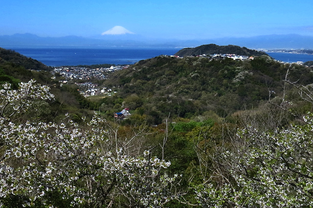 湘南国際村入口斜面のつつじ公園は有名である。まだ、ツツジには早いが富士山の眺望など景色がいいので、バス停「つつじケ丘」で下車する。下の遊歩道を左下に桜咲く山々と海を