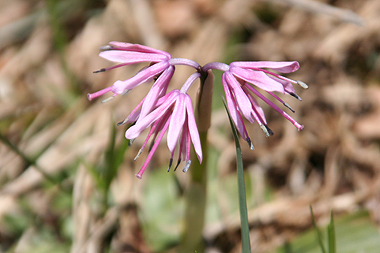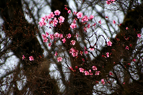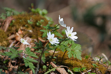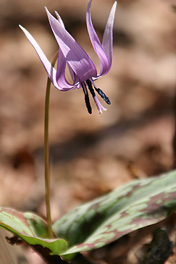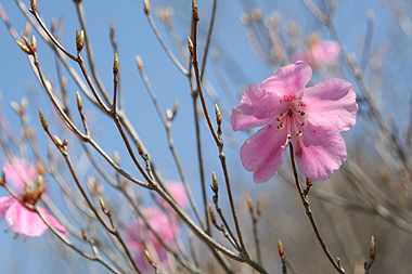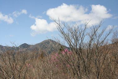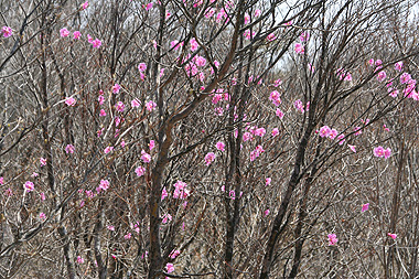 ('06-05-09歩く) 東北道矢板ICを降りて、4号線に通じる高架橋の左側の道を下って、直ぐ突き当たったところを左折して 矢板市役所の方に向う。天気予報は朝のうち曇りで日中は晴れであった。佐野、宇都宮あたりでは小雨であったが、ようやく上がった。しかし、今にでも雨が落ち てきそうな雲行きである。 道なりに行くと、間違いやすい県民の森方面の標識がでてくるが、それを見送ってしばらく行くと八方ヶ原方面の標識がでてくる。これを左折して八方ヶ原へと 上がってゆく。 下のほうではヤマツツジが満開である。上がるにしたがってガスが濃くなり、雑木林の芽吹きの緑の中にチラホラと ミツバツツジが見かけるようになる。幻想的で美しく、誘惑に負けて車をとめて写真を写す。さらに上がってゆくと山桜やアカヤシオ、オオカメノキの白い花が 霧の中に浮かんでいる。やがて右手に八方が原の大きな看板が出てくる。この10m位手前の左に入る道が大間々台方面である。実は素通りして、どんどん下り、 どうもおかしいと思って戻ってきて確認して大間々台へと向った。 上がるにしたがって木立ちの芽吹きの緑が冬枯れにかわり、ガスも切れてきた。やがて雑木林を抜けて広々とした潅木の原にでた。なんの木だろうとよく見るとつつじ のようである、しかし種類まで分からない。丁度、赤城山の白樺牧場付近の雰囲気に似ている。 ツツジが原を過ぎると道は終点となって右手にトイレもある広い駐車場に着く。そこには、今にも雨が降りそうなお天気からは想像も付かないような 大パノラマが展開している。雲海の上の山並みの彼方に那須連山がクッキリと横たわっていたのである。 身支度して見晴らしコースの 矢印に従って広い林道を行くと、直ぐ、左にやしおコースの道標があってコナラ、ミズナラ、ブナ、ダケカンバなどの混じる自然林の道に入っていく。道は 右手に尾根を見ながらトラバース気味に少しアップダウンを繰り返しながら回り込んでいく。自然林の道の脇にはカタクリ、キクザキイチゲなどが咲き、 モノトーンのさびしい冬枯れの風景に彩りを添えている。 やしおコースというからには直ぐアカヤシオが見られるのかな、と期待していたが、現われず、ブナの大木やカタクリなどを写しながらしばらくいく。 40分ほど歩くと樹林の間から谷を挟んだ正面にこんもりした山が見え、その山肌がところどころピンクに染まっているのが見えてくる。待望のアカヤシオである。 道は正面のピークに向かって右の斜面を急登し、そして周りこみながらゆく。アカヤシオが日差しを受けて頭上や左手の樹林の中でピンクに光っている。 その透明感あるピンクの大きな花びらは蝶が舞っているように見え、冬枯れのモノトーンの世界にイルミネーションを点灯したように輝いている。 道は先ほどのピークの右の肩の辺りにたどり着き、そこには大丸という道標がたっていた。ここが最もアカヤシオの多いところである。 また、大木の多い樹林の道を行く。10分も行くと青空コースとの連絡路となるが見送って真っ直ぐ行く。道端にはカタクリが多い。 また左に回りこむように行くと、樹間に点在するアカヤシオが多くなる。道はほとんど平坦となり、もうミツモチ山も近いと思うがなかなか着かない。 アカヤシオをめでながら連絡路分岐から15分ほど行くとやっと見晴台のある台地のはずれミツモチ山に達した。南の方を見ると海原のように雲海が広がり、 西側には満開のアカヤシオ越しに高原山の主峰釈迦ケ岳が望まれる。 ここより青空コースを経て剣が峰に登ることにする。 しかし、道標は青空コースの連絡路に戻るのしかない。展望台の南側下に林道が右から来ている。それが青空コースのようである。林道に下り、念のために 近くに休んでいた登山者に聞いてみる。間違いない。青空コースは砂利の林道である。兎に角暑い、道が広いのでさえぎるものが無いのと、砂利の照り返しのせいか、 30度は越えていたように思う。ところどころにブナの大木が立ち、つぼみの多いアカヤシオも数は少ないが彩りを添えている。