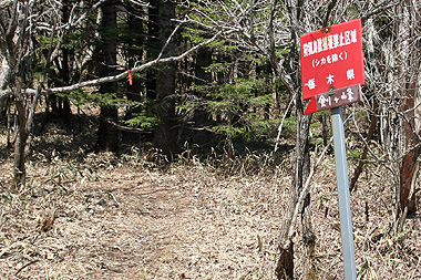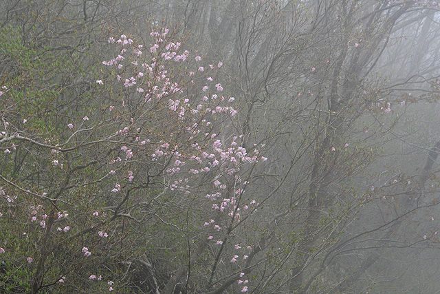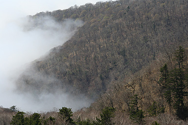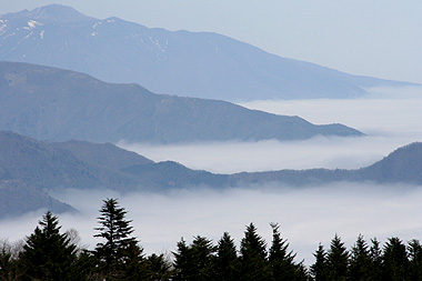 残雪のある樹林帯の道を15分弱登ると「矢板市の最高点1590m」とあるところに達した。しかし、剣が峰という名は無い。昭文社の地図ではその先の1540mのピークと の間に「剣が峰」と記載されている。剣が峰はどちらかと迷うところであるが、高いほうだろうと思い、ここで昼も近いので昼食とする。 昼食を取っていると駐車場から大丸まで一緒だった先に行ったはずの宇都宮のご夫婦が登ってきた。ショートカットルートを見落としたとのことである。 これから剣が峰へ行くという。驚いた、標高の低いほうの1540mのピークが剣が峰であったのである。 ここまで来て剣が峰に行かないてはない、昼食後ザックを置いて先の1540mのピークを往復する。 そして、展望の利かない林間コースを黙々と下ってこの山歩きを終えた。 大間々台の駐車場に戻ってきても朝の雲海の大パノラマの展望は変わっていない。車で、八方ヶ原入口(大間々台入口)付近に来ると ガスが濃くなり、雲海の中に突入した。今朝ほどの風景と同じ様に木立ちの中で淡いグリーンの芽吹きやアカヤシオ、山桜が 霧に煙っている。実に幻想的で美しい。また写真を写しながら下る。 ●コースタイム 自宅3:55==東名厚木IC==首都高速==浦和IC5:25==上河内SA6:27〜55==矢板IC7:03==大間々台(P)8:00〜10--大丸9:05〜10--青空コースへの連絡道9:19-- ミツモチ山9:37〜45--剣が峰登山口(ショートカットコース)10:29--1456m小ピーク10:47〜55--八海山神社11:20〜25--1590m矢板市最高地点11:38〜12:08--剣が峰 12:21--1590m矢板市最高地点12;38--八海山神社12:48--(林間コース)--大間々台(P)13:40 ●地図: ・昭文社 山と高原地図 「那須・塩原 2005年版」 |