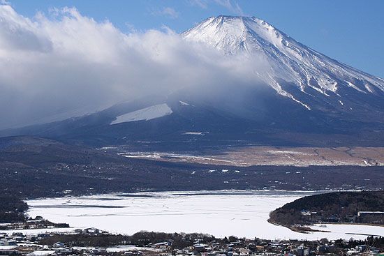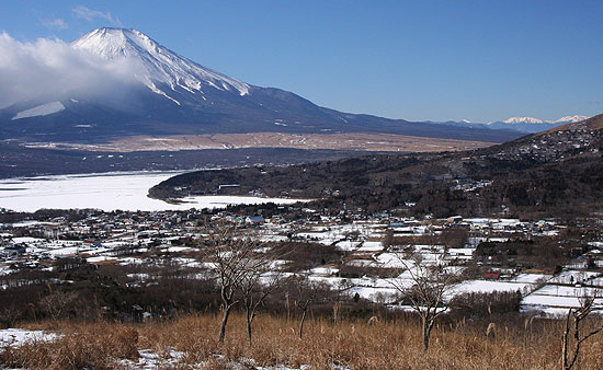 ![]() 高指山からの富士山 切通峠〜高指山〜富士岬平(06-01-09歩く) 年末に石割山に登ったが、意外に富士山の雪は少なかった。正月に入って、首都圏も、積もるところまでいかなかったが初雪が降った。 この分だと富士山も雪が多くなっだろうと思い、富士山展望の山、高指山に登ってみた。山中湖の平野の湖畔に車を置き、切通峠、高指山、平野と廻ることで計画したが、実際に高指山の先のピーク富士岬平まで行ったところ、直接、平野へ下る道 があったので、その道をたどって湖畔へ戻った。 いつもながら籠坂峠の道路状況はどうかと気になる。須走あたりまで行くと、「籠坂峠、チエン装着しない車は通行不可」 というような意味の看板が立っている。雪は1/7に降っている。当日は前日の晴の日を経ているので、道路は十分整備されていると予想して 上って行く。下ってくる車はチエンを付けていない。スタッドレスだけで大丈夫そうだと安心して籠坂峠を越える。 5cm位雪の積もった 山中湖の平野の湖畔の駐車場に着くと、雪化粧してすっきりした富士山がバッチリと見える。山中湖も凍結してその上に雪が積もり真っ白である。 カメラマンが富士山の写真を写していて、後ろ髪を引かれる想いであったが、写真は戻ってからとして身支度して早々に出発する。 平野の交差点からパノラマ台方面の車道を 鉄砲ノ木の頭や左に伸びる尾根を正面に見ながらゆく。湖畔から20分弱行くと分岐となり、右に直角に折れているパノラマ台への道を分け、高指山、切通峠へは 真っ直ぐ行く。5分も行くとまた分岐となる。左を指して高指山という道標があるが、どういうわけか切通峠方面への道標はない。この先、切通峠までも ない。ここは切通峠へ地図に従って真っ直ぐ行く。 やがて、送電線の***号鉄塔とかの標識が沢山立つ林道のY字分岐となる。ここは鉄砲ノ木の頭 から左に伸びた尾根の鞍部が切通峠であるので、見当をつけてその方向の右に行く(No.264鉄塔方面)。 少し行くと、左側の雑木林の枝に赤テープがぶら下がっており、間違いないと確信する。この後は赤テープが道案内してくれる。左にテニスコート が見えてきて、雑木林の中に入り、本格的な山道となる。ここまで、湖畔から約40分である。 ここから雪が多くなる。深いところで10cm位である。山道は掘れた道で歩きずらいが、雪があっても道が明瞭なのは助かる。 思いがけなくカラマツ林の中にブナの木が現われる。不思議なことに並木のように一列に連なっている。やがて、山道はY字に分岐している 所に至る。左側の上に上がる道に赤テープがぶら下がっているので、そちらの方へ行く。ここから勾配がきつくなる。 雪が降って以来、歩いた人はいなかったようで、雪面にあるのは動物の足跡だけである。やがて尾根が近づいてきて、 以前、鉄砲ノ木の頭から縦走して来たことのある道標の立つ切通峠に着いた。 ここより左に雪の尾根道を緩やかに登って行く。 左側は潅木、右側の東斜面はコナラなどの自然林で、明るい気持ちのよい道である。つい先ほど動物が通ったのであろうか、真新しい足跡が我々を導くように 尾根道の向う先に点々と続いている。そして、冬の日は低く、純白の雪面の山道に、冬枯れの木々がブルーがかったグレーの影を長く落としている。 その雪面に、惜しげもなく歩いた証の足跡を付けてゆく。冬山ならではの清々しい新鮮な気持ちになる。 やがて小ピークに達した。そのあたりはブナの 木も点在し雰囲気のいい所である。そこからは犬を連れて登ってきたのであろうか、犬と人の足跡が下へと続いている。足跡たどりながら急降下してゆくと、道標が 立ち、左、平野とある。帰りはここを下るのかと、一応、左下へ続く道を確認する。ここより、道はいよいよ高指山への緩やかな登りとなる。 左側は背の高いカヤトとなり、カヤト越しに富士山がみえ、右上の奥には自然林越しに高指山らしき山が見える。15分弱登ると、大きな 東海自然歩道の案内板があり、傍に道標が立ち、左平野とある。平野分岐は先ほど通過したはずと思ったが、案内板 を見て、この分岐が東海自然歩道の平野へ通じる正規の道であることが分かった。 高指山へはこれを見送り、真っ直ぐ行く。道は急登となり、南向きのため積もった雪は既に溶け、 足元がすべる。左側がカヤトの道はどんどん高度をあげ、富士山や鉄砲ノ木の頭などが競りあがってくる。写真を写し写し上ると、やがて 左側のカヤトも切れ、富士山側が大きく開け、高指山山頂に達する。 すばらしい眺めである。眼下に平野の別荘が箱庭のように広がり、その向こうに凍りついた真っ白な山中湖、 その上に、年末よりすっきりと雪化粧し左に雲をたなびかせた富士山、右には白銀の山々南アルプスが遠く光っている。時計を見るとまだ11時である。 昼頃まで先に行って戻ってくることにする。 すぐ雪のべったりついた樹林帯の急降下となる。雪の斜面には木立の長い影が映り美