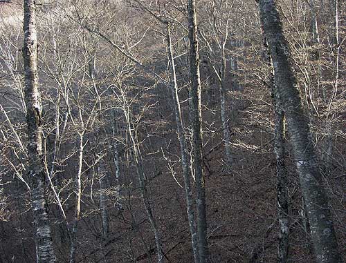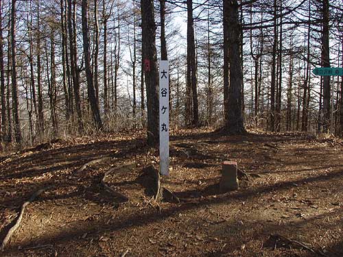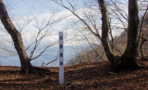 夕日で長い影を落とす米背負峠 < 樹林の道 米背負峠〜大谷ケ丸 > 米背負沢出合いから約一時間ほど歩くと米背負峠に着く。周りの木々の枝は低い朝日を浴びてちかちかと光り輝いている。 その中を大谷ケ丸へ右に登って行く。大谷ケ丸はハマイバ丸方面から見ると双耳峰に見え、右の方の北峰が 高く見える。主峰の南峰が奥まっているので北峰が高く見えるようである。 5分も登ると雰囲気の良い 平らな樹林の広場となり、冬枯れの木立越しに北峰が望まれる。すぐかなりの急斜面の登りが続く。 あえぎながら登りきると双耳峰の鞍部に到達する。大きなサルノコシカケを付けたブナやダケカンバの大木が立っている。 道は鞍部から左に緩やかに登っていっていく。美しい樹林の道である。やがて滝子山方面の標識のあるところに 到達するが、ひとまずすぐ先の大谷ケ丸山頂に向かう。山頂は樹林の中で見晴しはほとんど効かないが、 南面が少し開けて雪の被った南アルプスが望まれる。富士山は見えないか見まわしてみるが、周りの樹木の 間に白くそれと分かる程度で、葉っぱのある時期ならほとんど見えないようである。小休止してすぐ滝子山へと向かう。