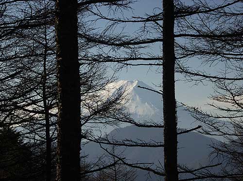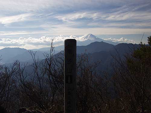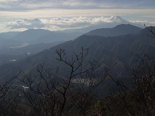 大谷ケ丸からの南アルプスの山並み < アップダウンの道 大谷ケ丸〜滝子山 > 大谷ケ丸から滝子山へは20m位戻って道標のところから右に急降下する。今まで登ったのがもったいないし、帰りの登りを 思うとうんざりする。だいぶ下ったように思えたが時間にしては5分程度である。 下る向こうにピークが見えまた登り返すことになる。こういうことを何回繰り返したであろうか。ノートにメモっておい たが同じような繰り返しなので良くわからなくなった。1/25000の地形図を見ると大谷ケ丸と滝子山間には 5箇所もピークがあり、それを登り下りしたことになる。それほどきついピークでないが、本当に登れども登れどもまた下るであった。 南大菩薩の風景からして、このコースに期待をもっていた。しかし、山道の右側は植林したのであろうかカラマツ林で、左側はミズナラ 、コナラ、ダケカンバ、時にはブナの混じる自然林であり、ピークは決まってモミなどの黒木の混じる ところとなったが、ほとんど目をみはる樹木はなく、さらに見晴しは効かず、期待はずれであった。その中で1ヶ所だけアモウ沢乗越のあたりはブナの大木があり 雰囲気の良いところであった。カラマツの若木とカヤトの道になってようやく笹子からの道と合わさった。 大谷が丸から一時間である。 ここからはゆるやかに5分ほど登ると小さな鳥居と祠のある鎮西ケ池 に着き、さらに少し急なところを登ると尾根に出る。ここには道標があり、左初狩、右山頂とある。 この道標にしたがって右に急登すると滝子山の標識の立つ山頂に達した。南アルプス方面が木々でさえぎら れ若千見通しが効かないが、期待はずれのアップダウンの道を帳消して余りある大展望であった。 富士山も写真のようにバッチリであった。後を振り返ると、大谷ケ丸を発した南大菩薩の尾根が白谷が丸、黒岳に達し、 右に雁が腹摺山がすぐ前に手に取るように見渡せられる。