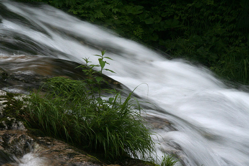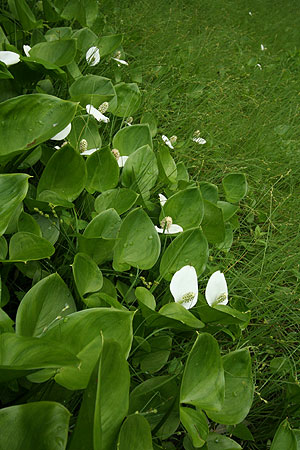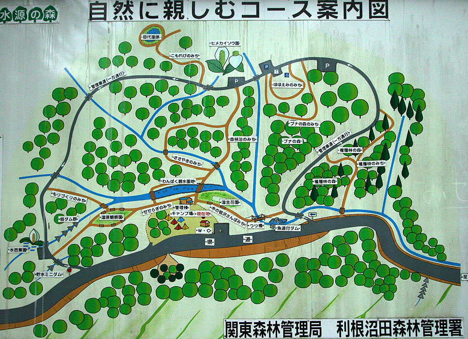 結論から言うと、森もいいが、その途中の湯ノ小屋沢川・照葉峡の連続して現われる滝がいい。それに湿原がある。 いろいろ楽しめるところがいい。新緑の頃、紅葉の頃、最高だと思う。 地図を見ると湯ノ小屋温泉あたりから湯ノ小屋沢川渓谷沿いの尾瀬の戸倉に通じる道が延々とのびている。 狭い、深い谷間の薄暗い道かと思ったら、全線舗装されて、道の直ぐ脇が渓流の明るい道であった。 滝のあるところには滝の名前の書かれた標識が立っている。それを見つけては車を止めて、写真を写して進む。 一個、二個ならそれでもいいが、次から次へと出てくる。とうとう連れがあきれて、「これでは湿原まで行けないよ」、ということ になり、帰り時間があったら写すことにして先に進む。 この奥利根水源の森の概念図は下に掲載した案内板の写真の通りで、森を取り囲むように一方通行の半円状の林道が通っている。その半円の中心にキヤンプ場があり、その広場には 駐車スペース、きれいなトイレがある。昭文社の山と高原地図では駐車は有料となっているが、シーズンオフなのか管理棟も閉じていた。 誰もいないガランとしたキャンプ広場に駐車させていただき出発する。真ん中の森林浴のみちを経て湿原に行くことにする。 道標が分岐点にあり、迷うことはない。オオバミゾホウズキ、キンポウゲの咲く湿った道を下っていくと川原に出て橋を渡り、直ぐささやきの 道との分岐となる。そこを右に森林浴の道へ橋を渡って樹林帯に入ってゆく。 ブナ林の道を道なりに緩やかに登って行く。 白いギンリョウソウがあちこちに顔を出している。花というとミズキの花が白くなりかけているくらいで 目だったものはない。ブナの木は巨木はないが、ところどころに密集して生えているのが今まで見てきたところと違っている。 途中には、このブナの森では、若いブナの木を育てるために、ブナの間伐、ブナの幼木の周りの笹や潅木の刈り取りをおこなっている、との説明板が 立っている。 緩やかな遊歩道のような道を約35分も行くと、森林浴駐車場という標識の立つ半円周回林道に突き当たる。 この林道を左に下ってゆくと直ぐ田代湿原の入り口であるヒメカイウ園駐車場に着く。ヒメカイウ園があるかもしれないが、見渡した限りでは 見当たらない。田代湿原方向の道標にしたがって右の樹林帯に入ってゆく。 ここからも豊かなブナ林の斜面に作られた稲妻道を 登って行く。そんなに急であるわけでもなく、遊歩道という感じである。ブナの林立が美しい。ツルアジサイの花が高くブナの大木に絡みつき 今盛りと咲き誇り、深山の趣きを漂わせている。足元のあちこちにはギンリョウソウが顔を出している。25分も歩くとブナの大木が多くなり、傾斜も ゆるみ、熊笹の下生えの上にブナなどの大木が林立のする明るい樹林帯となり、やがて、木道と大きな案内板が現われ、田代湿原となる。 しかし、案内板が大きくて田代湿原が見えない。裏に廻ってびっくり、樹間から、開けた田代湿原にコバイケイソウの花が咲き乱れているのが見える。 開けた広い空、それに白い清楚な花、清々しい気持ちになる。左遠く朱色のツツジらしいものまで見える。左回りで 回り込んでゆくと、木道が現われ、先ほど遠目に見えた朱色のレンゲツツジが目に飛び込んできた。期待していなかっただけに大感激である。 田代湿原はこの20〜30mの間だけ湿原を木道が横断しているだけで、後はまわりを廻るだけで、花の観察という意味では不都合である。 樹林帯に入ると直ぐ花咲湿原と田代湿原周回山道との分岐となる。田代湿原周回山道は帰りに行くとして、まっすぐ花咲湿原の方に進む。 するとヒメカイウの群生地がある。ミニ水芭蕉という感じの可愛いめずらしい花であった。写真を写してブナの美林の道を先に進む。道は初めて 急斜面の下りとなる。しばらく下って小さな沢を渡るとまもなく花咲湿原である。案内板も何もない。木道が湿原の中を真っ直ぐと伸びている。 ところどころに迂回する木道もある。真っ直ぐ端まで行って、帰りは迂回の木道を通って来た。田代湿原ではレンゲツツジとコバイケソウ が花盛りだったので期待したが、標高が低いのか、コバイケソウは終わりかけていたし、レンゲツツジはないところであった。 花といえばハクサンチドリ、ワタスゲ、終わりかけて色の変わったコバイケソウというところであり、端境期のようであった。 しかし、名前はわからなかったがこれから咲きそうなつぼみは沢山あった。木道は湿原の真ん中に設けられているし、花の観察にはいい所のようである。 花咲湿原を散策した後、初めて急登をして田代湿原まで戻り、左に湿原周回山道を進んで田代湿原の案内板のあるところに戻った。 まだ、昼には少し早かったが、ベンチがあり高いブナに包み込まれていい雰囲気の所であったので昼食とした。この後、元来た道を戻り、水源の森では途中からささやきの道に入っ