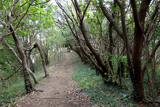変則十字路となっている。ここはまっすぐ美しい照葉樹の森を登ってゆく。登りきると、今度は「平砂浦展望台」