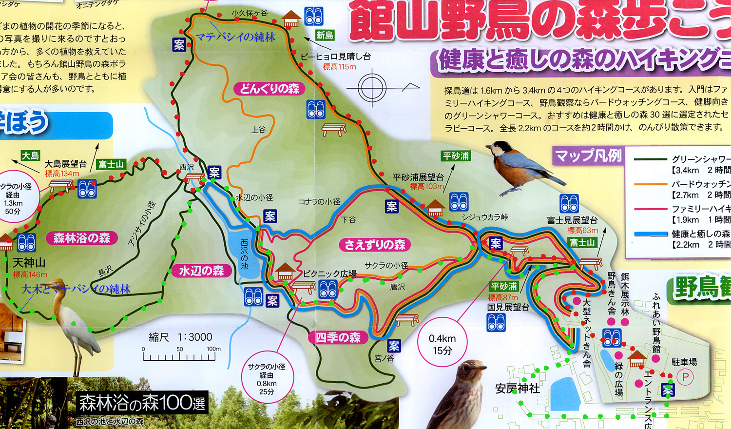 ・館山野鳥の森パンフレット、ハイキングコースマップ⇒⇒赤が行き、緑が帰りのコースです。