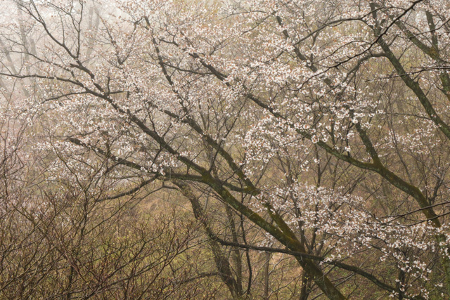 終点で降りても止む様子はない。傘をさし住宅街から林道に入り、周りの芽吹きやヤマザクラが霧に煙る幻想の世界を登ってゆく。