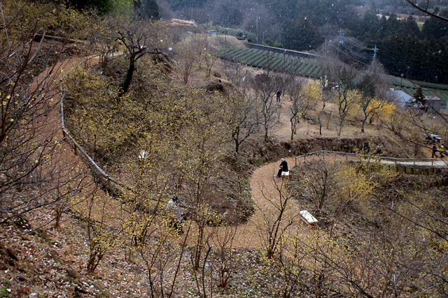 雪が舞い落ちてくる。やがて左にカーブすると、ロウバイ園入口となる。