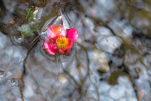 この道標点で右下の沢に降りて渡渉が始まる。浅い清流と滑めの連続で、ツバキもところどころ落ちていて彩りを添え、一か所であるが小滝もあった。