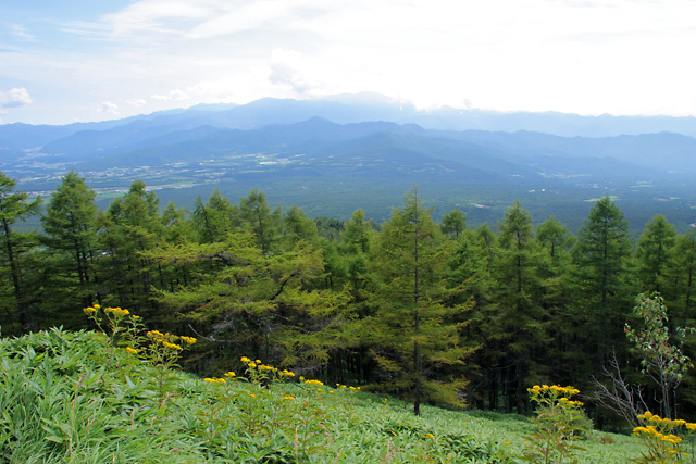 やがて、カラマツ林が切れてきて、ハンゴンソウの咲く、見晴らしの良いところに到達する(上の写真)。写真撮影しながら休憩する。