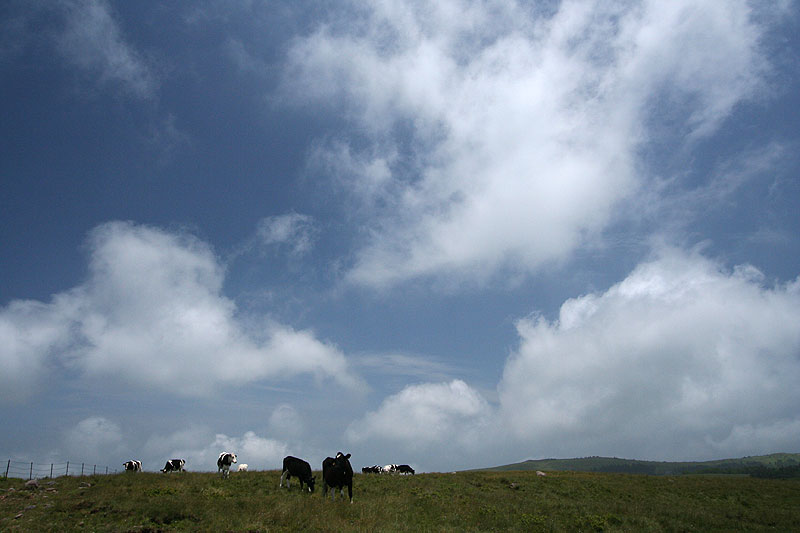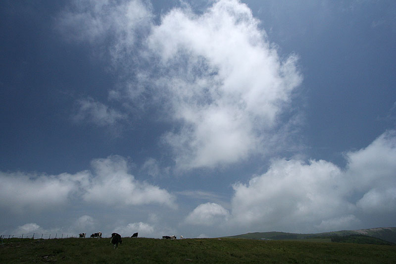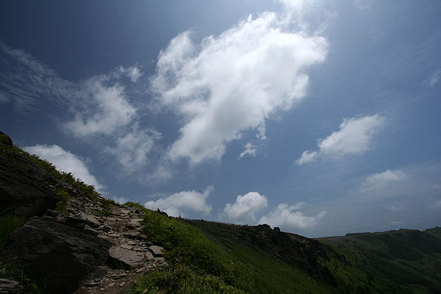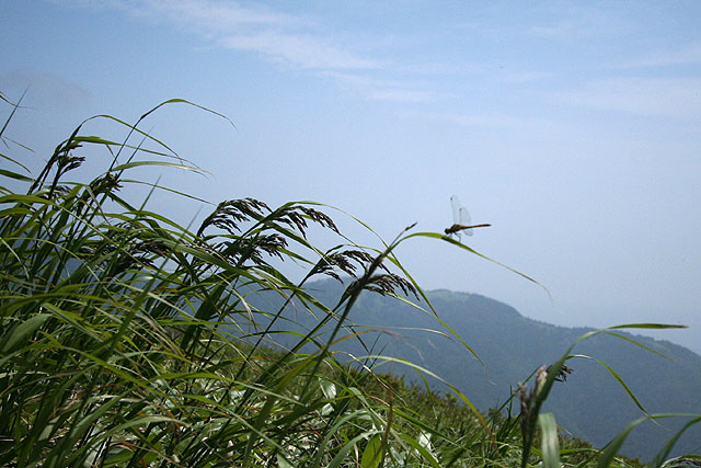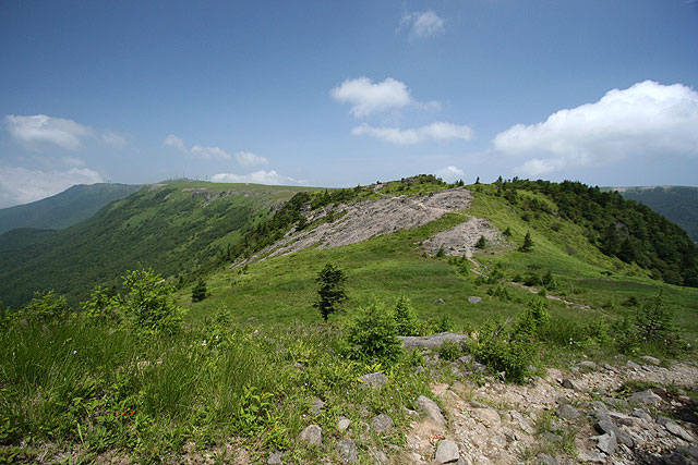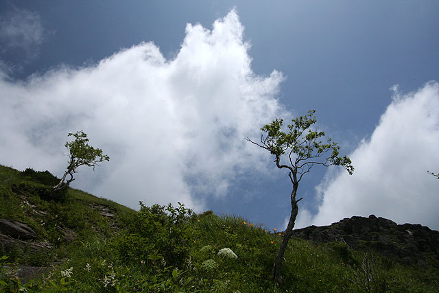 美 ケ 原 〜 県民の森から茶臼山 〜 ![]() 県民の森から茶臼山へ('05-07-22歩く) 登りついて不意に開けた眼前の風景に しばらくは世界の天井が抜けたかと思う やがて一歩を踏みこんで岩にまたがりながら 此の高さにおける此の広がりの把握に尚もくるしむ 無制限な おおどかな 荒っぽくて 新鮮な 此の風景の情緒はただ身にしみるように本源的で 尋常の尺度にはまるで桁がはずれている 秋が雲の砲煙をどんどん上げて 空は青と白との目も覚めるだんだら 物見石の準平原から和田峠の方へ 一羽の鷲が流れ矢のように落ちていった 美ヶ原の美しの塔に尾崎喜八の上の詩が刻まれている。この美しい詩は百曲がりを登り詰め美ヶ原の溶岩台地 に達した時の喜びから生まれたという。 溶岩台地まで車道が上がり、美ヶ原は観光地化されているが、そこまでのアプローチは昔の面影が残っているのではないだろうか。一度、 百曲がりを通って尾崎喜八さんの感覚を幾分でも味わって見たいものだと思っていた。 諏訪ICから霧が峰に上がると、ニッコウキスゲの花が今が盛りと咲いている。それを横目に和田峠・扉峠へとビーナスラインを進む。 扉峠から三城牧場(さんじろぼくじょう)を目印に松本の方に向う。折角、扉峠まで上がったのに、どんどんと下り、茶臼山から王ケ鼻にかけての右側に見え隠 れする絶壁の尾根がどんどんと高くなってくる。しばらくすると右側に県民の森と書かれた立派な柱の看板が立ち、その右に森に入る道が見える。 地図によると三城牧場と県民の森の広小場というところに駐車場がある。どちらにしょうかと決めかねていたが、最初に目に付いた 県民の森の看板、広小場の方に向う。道はダートであるが、整備されていて走りやすい道である。カラマツ林の中を行くと中央キャンプ場 というところになり車もおけるが、地図に従って先に進むと、林道は終点となって駐車スペースとトイレのある広小場に着く。 案内板の略図を見ると、広小場は茶臼山・美ヶ原牧場周回の基点として最適であった。どちら廻りで周回するか。 百曲がりは、以前、山本小屋から茶臼山往復してたとき眼下に切れ落ちた絶壁のように見えた。登るのはきつそうに思えたので、楽そうな 茶臼山遊歩道の方から登ることにした。県民の森案内板や道標が新しくなっている。 心地よいせせらぎの音と小鳥のさえずりを聞きながら、大門沢沿いの山道を緩やかに登ってゆく。 すぐ、カラマツ、コメツガ、さわら、潅木の混じる薄暗い森と伏流水の石のごろごろ転がっている沢沿いの道となる。 道は石が多くて歩きにくい。景観のよい道と思ったら期待はずれであった。時々、日差しの入るところにはコオニユリが咲いていて 気持ちを紛らわせてくれる。 約40分ほど登ると、左岸の道は右岸に渡り、歩きにくかった石の多い道とはお別れして、カラマツの美林の斜面を 稲妻状に登って行く。それから20分ほど登ると道はまた沢に近づて源流に達し、小さな岩場の鎖場となる。鎖を使うほどでない岩場を登り、振り返ると、 樹間から美ヶ原の大きな船体のような溶岩台地が見えてくる。ずいぶん登ってきたと実感する。ここからはコメツガの多い斜面を時々樹間から溶岩台地 を見ながらジグザグと登って行く。 そろそろ尾根かと思うが、なかなか尾根に達しない。上にピークらしいものが見えてきて、そこまでかと思ったら、道は ピークの右を巻くようにトラバースしてゆく。やがて左斜面の木々が伐採され、大きな板状のアンテナが立つ、開けたところに達し、右手にはアンテナの林立する 溶岩台地が大きく見える。ここまで、広小場から1時間25分であった。5分ほどカラマツ林のトラバース道を巻いて行くと右手前方に ようやく尾根とロッジの屋根が見えてきて、やがてロッジの上の分岐点に達した。 ここから左へ、下生えが小笹のカラマツの明るい道を登って行く。アキアカネが飛び交い、もう山の上は秋が忍びよってきているようだ。5分ほどで 見覚えのある山頂に着いた。誰もいない静かな山頂である。アキアカネが時々吹き抜ける風に任せて飛びかっている。 周囲の重なる山並みはかすみ、水墨画のように遠くになるにしたがって薄くなり、空に消えて行っている。 小休止の後、美ヶ原牧場の塩くれ場の方に下る。前方下をみると、くねりながら伸びる登山道のトレースのはるか先に王ケ頭のアンテナ群が林立している。 足元では、ウツボグサやフウロウが咲いている。ヤナギランはまだ早いようだ。茶臼山の斜面を下り、溶岩台地のガレ場に降り立つと、傍の深緑の草原には星をちりばめたように フウロウが点在し、ところどころにコウリンカが群生している。 山道はクランク状の牧柵の入り口を経て、牧場に入ってゆく。古いガイド(山渓、アルペンガイド 美ガ原・霧ガ峰・蓼科1988年)によると、ここは「夢ノ遊歩道」と名づけら れているお花畑の道ということである。8月にはもっと花が咲くのであろうか、今はフウロウ