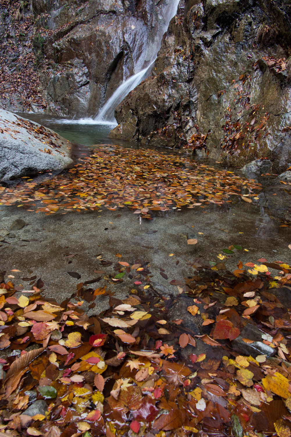 そこには思いもしない絶景が待ち受けていた。美しい落ち葉が滝つぼに丸く浮かび、ゆったりと廻っている。しまった、こんな光景があるとは予想しなかったので