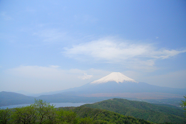 1446mピークからのまばゆいばかりの新緑の尾根が山中湖の方に下っている。緑一色でもこんなに豊かな色彩になるんだ、と5月の山に驚かされる。