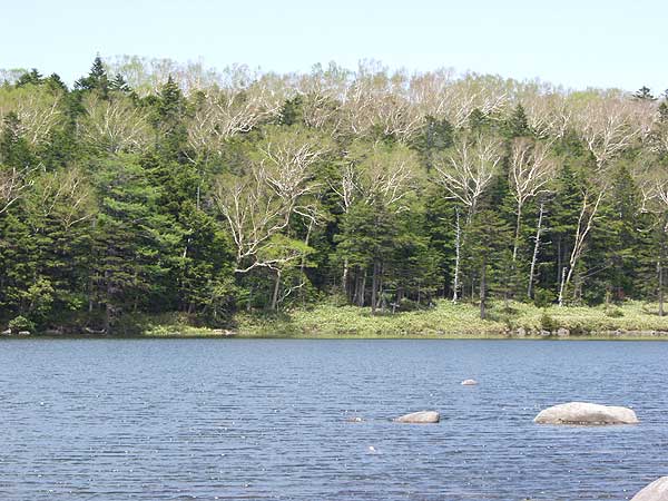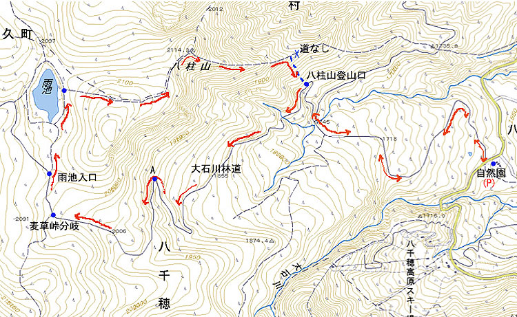 八千穂高原を起点に雨池から八柱山へ(04-06-03歩く) 昨年、この時期、八千穂高原から八柱山を往復したが、近くにある雨池には寄らなかった。大石川林道(大河原峠林道)を通って雨池に行くと周回でき るようなのでいつかは歩いてみようと思っていた。 今回は大石川林道(大河原峠林道)の八柱山登山口の右の登山道を登らないで、林道をそのまま直進し、先に雨池に行ってそれから八柱山 ・八千穂高原というルートで歩いた。 八千穂自然園の駐車場から八柱山登山口まで約一時間である。 昨年同様、カッコーや鶯のさえずりを聞き、白樺林などを写しながら歩いた。八柱山登山口からの林道は結構長い、両側笹の茂ったカラマツ林 が延々と続く。途中、ミヤマザクラ、沢のクリンソウ、ダケカンバの新緑、などが見られるが、単調な道である。 林道は緩やかに上りだし 、ヘヤーピンカーブに差し掛かると周りの景色は高山らしい雰囲気のシラビソの森に変わってくる。そしてもう一つヘヤーピンカーブを 登りきると登山口から約一時間である。そこからさらに飽き飽きしながら30分歩くと、やっと麦草峠からの道が左から合わさりホッと する。そして約5分間歩くと雨池入口となって山道に入る。 山道は木道である。最近整備したようである。ずっと池まで木道かと 思ったら、途中からぬかるんだ山道となり、ぬかるみにはまらないようルートを拾いながら進むのに往生した。雨池入口から約15分ほど 歩いて雨池の南端に出た。 今まで雨池には秋に来ていた。西岸から見る池は水が枯れて石がごろごろしていた風景だった。 今回は南東岸から眺めたこともあるが、それと同じ池とは想像もつかない風景であった。満々と水をたたえ、静かなたたずまいを見せている 。あの退屈な林道歩きを帳消しして余りあるいい風景であった。 池畔で写真を写しながら小休止した後、八柱山へ向かう。この雨池から八柱山までの道は何も期待していなかった。ただ、 ただ、40分のアルバイトを早く消化したい、という気持ちでシラビソの道を登っていった。道の足元にはミヤマカタバミの花が咲いている。 すぐフラット道になった。意外や意外、ダケカンバ、シラビソ、カラマツなどの大木の茂るいい雰囲気の道になった。見事な森である。 それがしばらく続く。そして最後に3分ほど急登して苦労なく八柱山に着いた。 八柱山で昼食をとって、見覚えのある カラマツの古木のある道を下ってゆく。下りもいい雰囲気である。足元にはマイズルソウ、ツバメオモトが昨年同様咲いている。 カラマツの植林された整然とした新緑の林立も美しい。やがて林道に降りたち、日差しの加減でまた別の表情を見せている白樺林 を写しながら八千穂自然園の駐車場へと戻った。 最初、林道を歩いているときは単調でどうなるかと思ったが、雨池と、雨池から八柱山への大木の茂る森がすばらしく、いい山歩きであった。 自宅4:10−相模湖IC5:25--双葉SA6:15〜48−八千穂自然園駐車場(P)8:12〜20 −八柱山登山口9:32−ヘアピンカーブ(A)10:35−麦草峠分岐11:04−雨池入口11:10−雨池11:25〜45--八柱山12:30〜50-- 八柱山登山口13:45--八千穂自然園駐車場(P)15:00 ・昭文社 山と高原地図 「八ヶ岳-蓼科・美ヶ原・霧が峰-」2003年度版 ![]() |