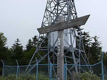 | ここら辺から尾根にはカラマツの古木が目立ち、斜面には若いカラマツが林立している雰囲気のいい登りである。 やがて樹木の少ない草地の登りを2箇所ほど登りきるとひょっこりとアンテナ塔の立つ八柱山につく。 頂上は広場にはなっているが周りは木が生い茂ってほとんど見晴らしは効かない。 |