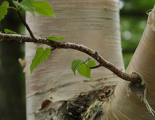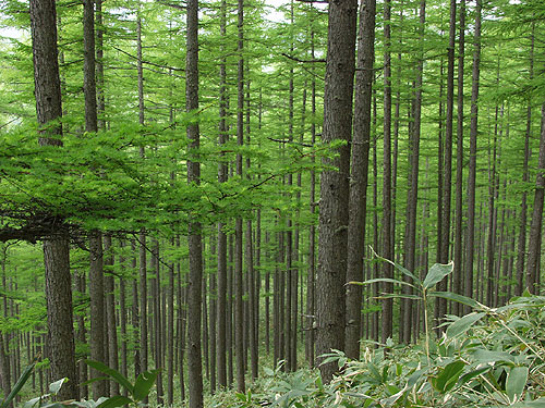 | 山道は整然と林立する美しいカラマツ林の中を登って行く。20分ほどジグザク登ると白樺と少し赤らんだつぼみ