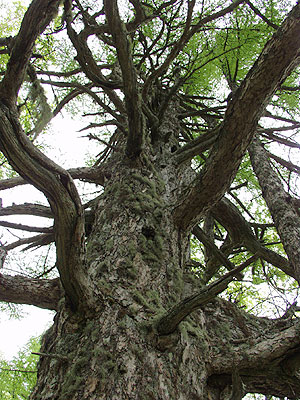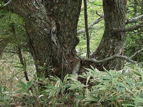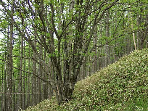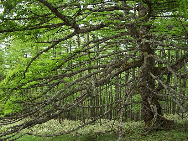 | 15分ほど登るとまた平坦になり、ダケカンバの若木が林立している。またすぐ登りとなり、 唐松尾根の名にふさわしいカラマツの古木が出てくる。カラマツというと真っ直ぐに林立した 姿を想像するが古木は結構曲がりくねっている。 |