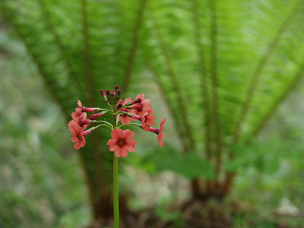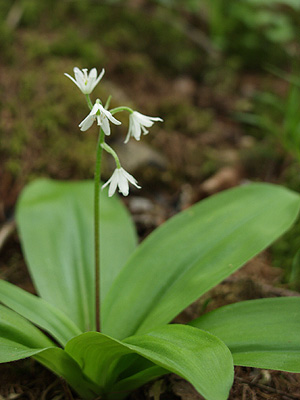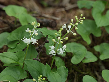 を付けたレンゲツツジが見えてきて唐松尾根に登りつく。 なお、昭文社の山と高原の地図にはこの尾根には右に行く細い山道もあって、八千穂高原池の平牧場付近に 尾根伝いに下ることができるように記載されているが、踏み跡は見つからなかった。どうも細い山道は消滅しているようである。 平坦な尾根を左に行くが、平坦はつ かの間で急登が続く。道端にはツバ メオモトやマイズルソウがかわいらしい花を付けており、疲れを癒してくれる。 |