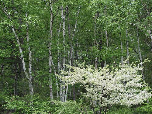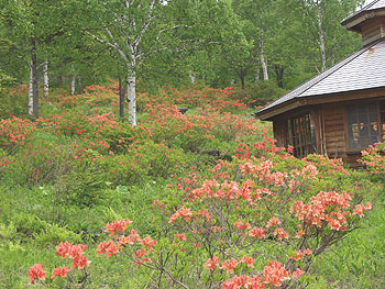 | 花木園の右側の林道が八柱山への入り口である。白樺の点在する花木園の敷地は燃えるような レンゲツツジで埋め尽くされている。林道は緩やかに上っている。両側はどこまでも白樺林である。 所々にレンゲツツジやズミの花が彩りを添えている。そのコントラストが実に美しい。 しばらく行くと林道は左に折れるが白樺の美しい風景は続く。気に入ったスポットで写真を写しながら 行く。人は誰もいない。静かである。カッコーや鶯の声が時々聞こえる。 |