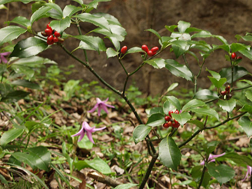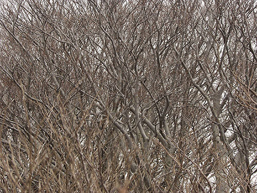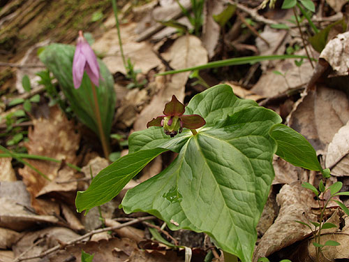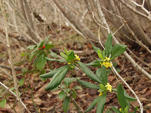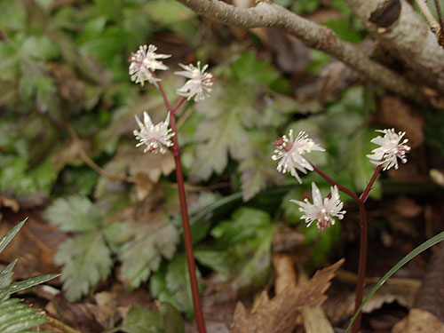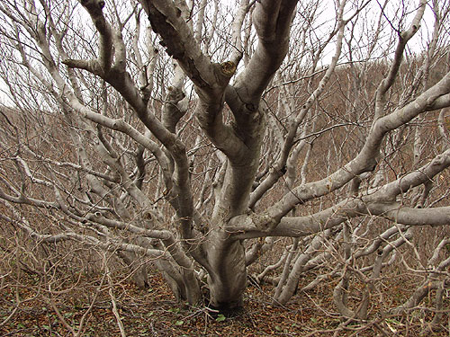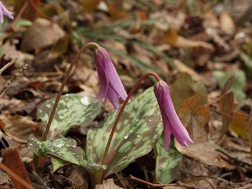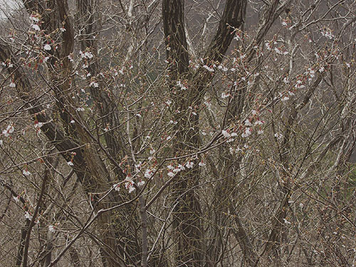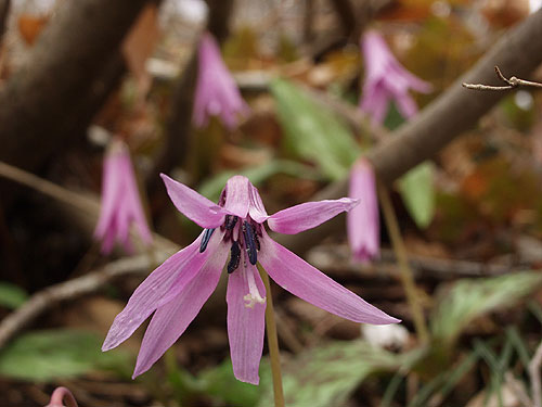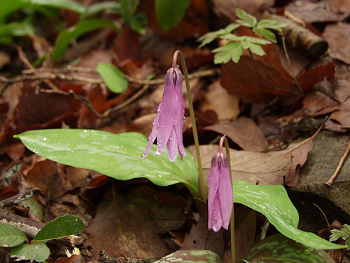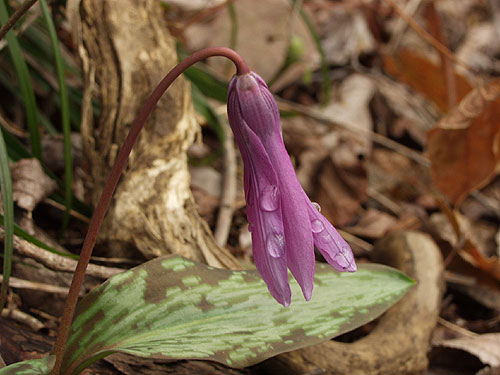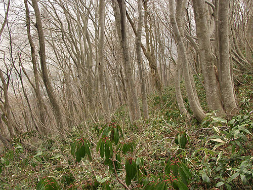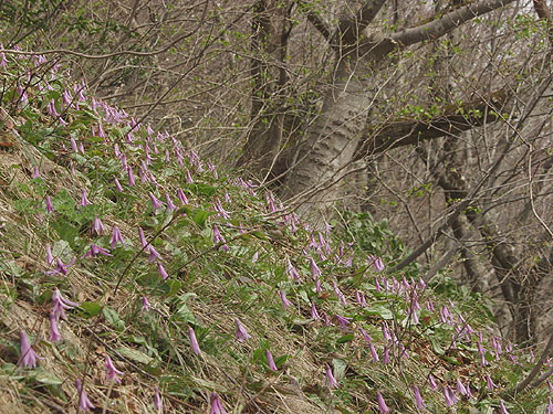 弥彦山('04-03-31歩く) 角田山から下って角田浜海水浴駐車場に戻り、その晩の宿であるグリーンヒル山彦へ 海岸道路を通って向かう。 走り出したら雨が本格的に降ってきた。その日は一晩中降っていた。 明日は帰る日である。自由になる時間はお昼頃まで、多分雨だろうと思い長岡の雪国植物園に行 くことに決めていた。 ところが翌朝起きてみたら雨が上がっていた。急遽予定を変更して弥彦山に登ることにした。 登山コースはHP仲間のnoritanさんに教えてもらった八枚沢コースをピストンすることにする。 片道1.5時間、丁度昼までには戻って来れそうである。 弥彦から海岸へ山裾を越えて出る道があり、途中から弥彦スカイラインが弥彦山へ登っている。 スカイライン入り口の大分手前の雨乞山と弥彦山に挟まれた右の谷から矢川が流れ下ってきている。 その谷沿いに林道が入っていっている。この林道の終点が八枚沢コースの登山口である。 車を7,8台置けるスペースがある。8:10に着いたが駐車している車はなかった。 そこにはハイキングコースの案内板があり、登山道は落差10m位の滝の脇から急登している。 登り出すといきなりカタクリが歓迎してくれる。夕べ雨が降り今も曇っている。 そのため花は雫を付けて閉じたままうつむいている。 後は一本道である。以下、詳細は割愛するが、 登山口付近のマメザクラ、途中のカタクリと白い雪割草、山頂近くのマンサクとブナであろうか 樹木等、が美しい。また、海岸線を望む展望もすばらしく、なかなかいい山であった。