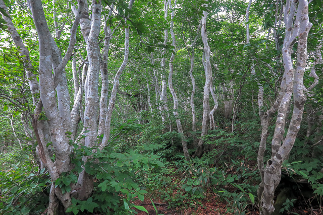 倉方で昼食の後、荷物を置いて上に10分程上がってみたところ、上の写真のような更に矮生のブナ林が現れた。