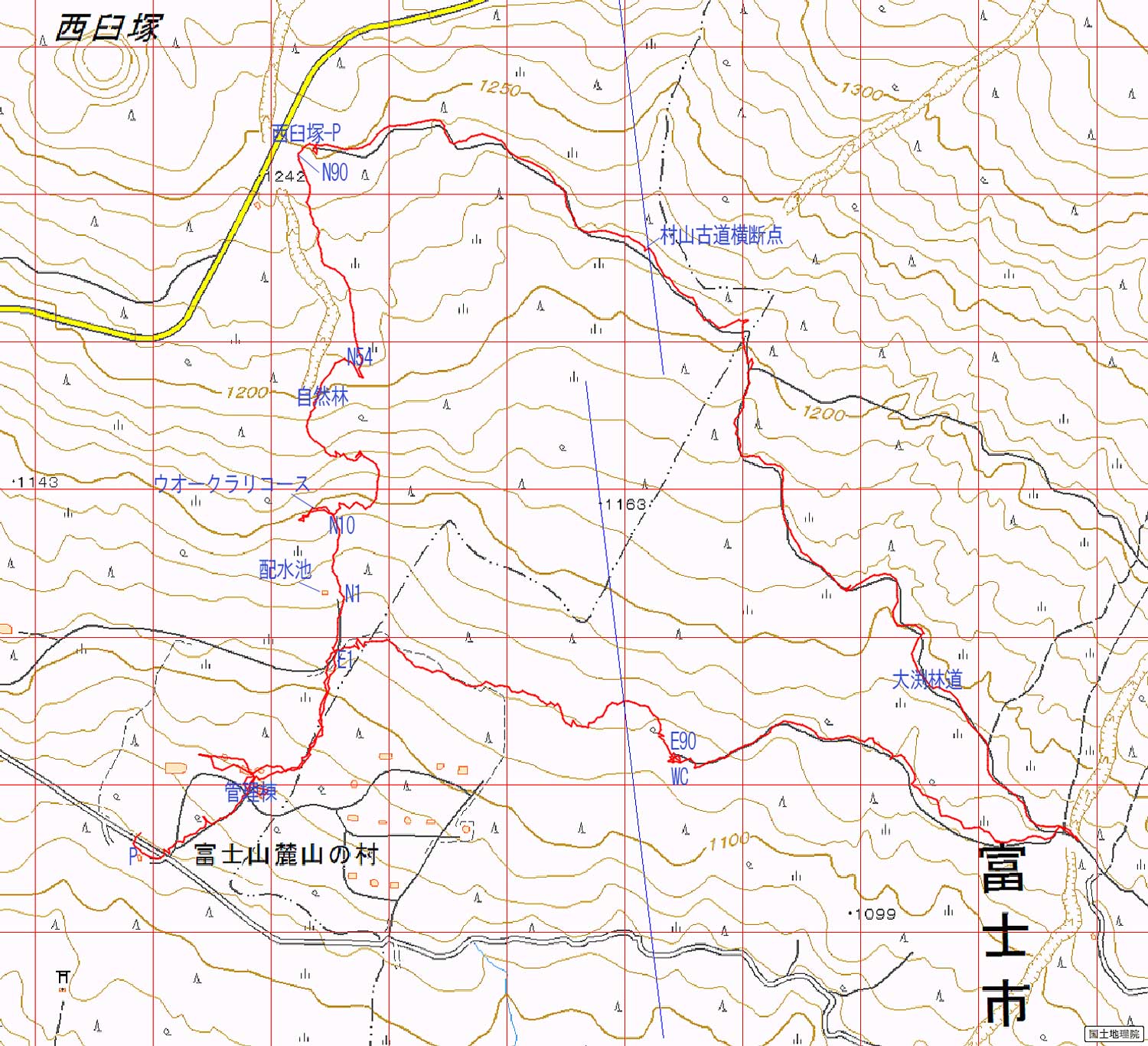 山の村P8:00---管理棟8:09〜16---分収造林地分岐E1 8:27---WCE90 9:02〜06---大渕林道合流点9:30〜36---村山古道横断点10;21---西臼塚南駐車場10:38〜45---