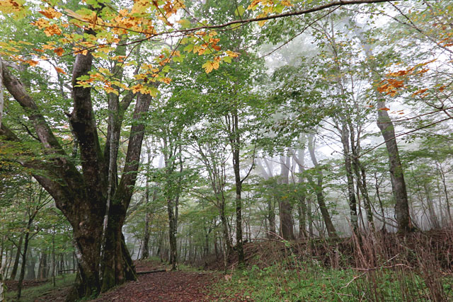 などの巨木の道を下ってゆく。ガスが流れてきて、幻想の森となり、時間が止まっているようだ。
