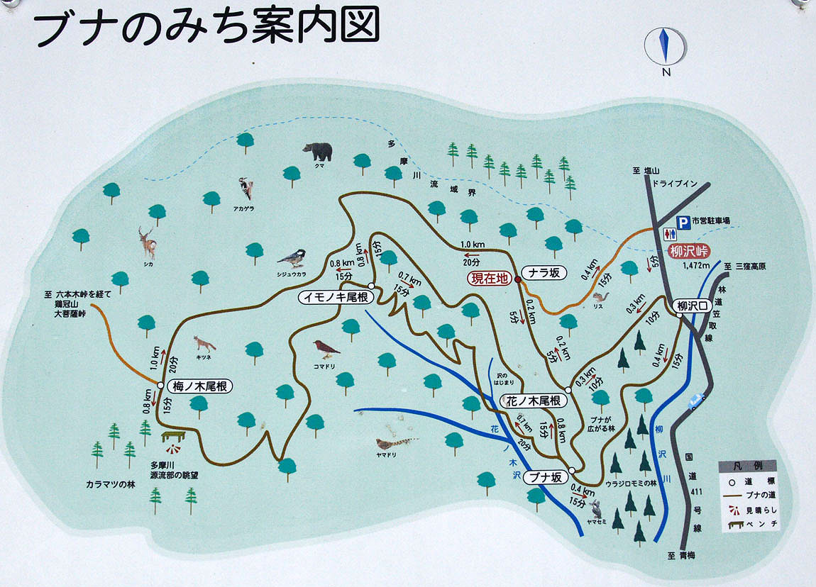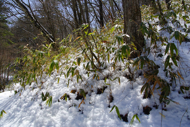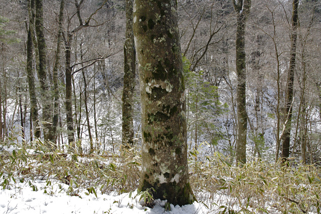 | 柳沢峠・雪のブナの道を行く ('07-04-20) ソメイヨシノや山桜の残る奥多摩湖から芽吹きやミツバツツジが彩る早春の風景を楽しみながら 青梅街道を柳沢峠へと上って行くと、予想もしなかった風景が現れた。それは雪で覆われた山肌に冬枯れの木立ちが林立する冬山の風景であった。 二日ほど前の里の冷たい雨は山では4月にしては珍しい大雪であった。桜の風景を写そうと奥多摩湖、大菩薩上日川峠、富士五湖などを廻る予定できたが、こういう雪景色に出会う と山好きは落着かない。急遽、予定を変更して 、以前歩いて勝手知っている「ブナのみち」を歩いてみることにする。 国道の向かいの階段を登って小笹の繁る樹林帯に登って行く。今年の冬は関東地方は一度も雪が積もっていない。 久しぶりの雪の感触、初雪の雪野原を駆け回る小犬のようにハイな気分になる。先ほど桜やミツバツツジを写して春爛漫に慣れた目には雪の白さがまぶしい。積雪は深いところで 15〜20cm位ある。世の中、好きな人がいるもんで、ここの遊歩道はいろいろなコースに分岐しているが、既にすべてのコースに踏み跡がついており、全く迷うことはない。 下草が小笹のブナが混じる自然林の雪道を行く。いつも見るあの深緑の笹がいやに今日は黄緑で若葉のように瑞々しく美しい。 新しく一斉に芽吹いてきたのであろうかと思ったくらいである。そんなわけはない、よく見ると、笹の下の雪からの反射光で照らされ、透けているような感じにみえるものであった。 また、15cm程度の積雪なので、笹の葉っぱは埋まることなく顔を出し、その点在する緑と雪のコントラストもまたいい。 雪のない冬枯れの森の山道は、空を仰ぎ見みて、幹や梢のシルエットを楽しむくらいしかないが、今回はいつもは地味な小笹の林床が美しい。 そんな足元の風景を楽しみながら1時間弱歩くと、ブナの道の最高地点のベンチとテーブルの ある展望台に着く。そこからは多摩川の源流部の笠取山など白銀の奥秩父の山並みが連なって見える。実に清々しい。 軽い昼食を済ませすぐ出発する。昼になって気温が上がってきたせいだろうか、森は雨が降っているかのように、木々の枝に積もった雪が溶けて雫になって落ちてくる。やがてブナの大木が多くなる。上を見上げると木肌が雪解けの雫に濡れ、 日に照らされ光り、ほとばしるエネルギーを感じる。ブナ達は、天から恵みの雪を受け、長い冬眠から覚め、芽吹きに向けて力強く活動をはじめたようである。 予定外の雪山のハイキングであったが、今年は暖冬で雪も降らず、ズルズルと春になり、今ひとつ区切りのつかない気持ちであったが、これですっきりしたような気分となった。 これからブナの芽吹き、新緑が楽しみである。 (地図) ・ 昭文社 山と高原地図 「大菩薩嶺」 ・ 略 図----最外周の遊歩道を反時計廻りに一周しました。 (コースタイム) 柳沢峠(P)10:52--展望台11:46〜11:56--柳沢峠(P)12:50 |