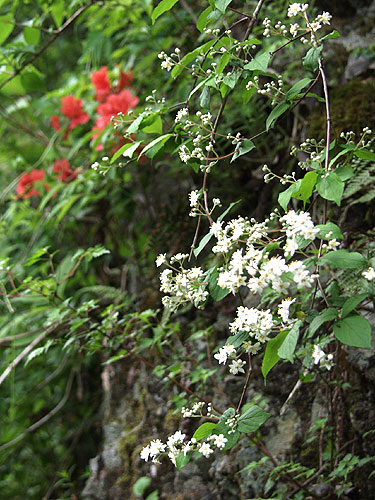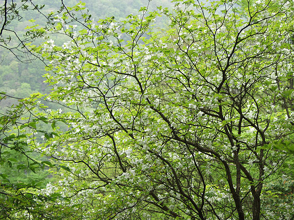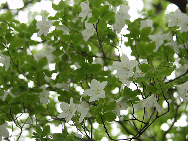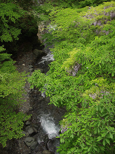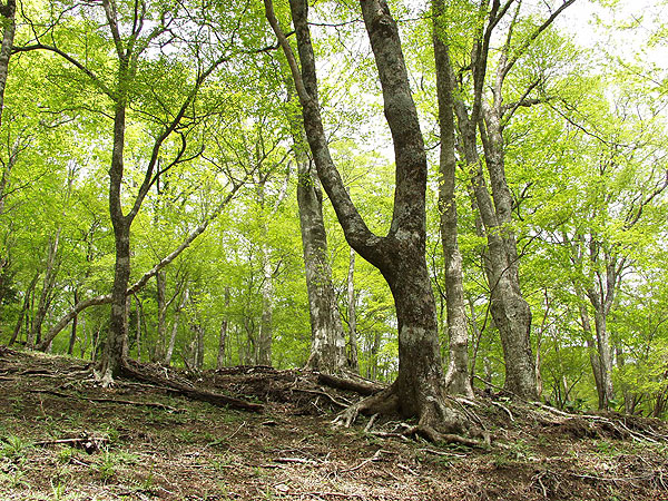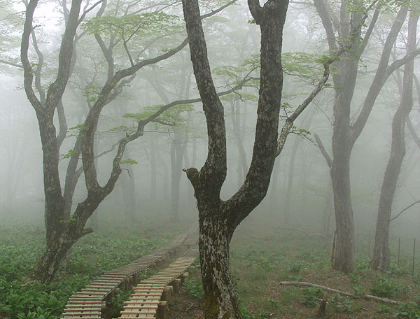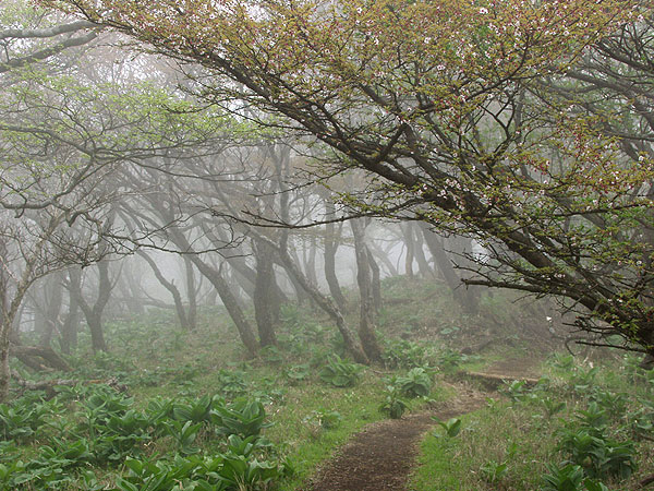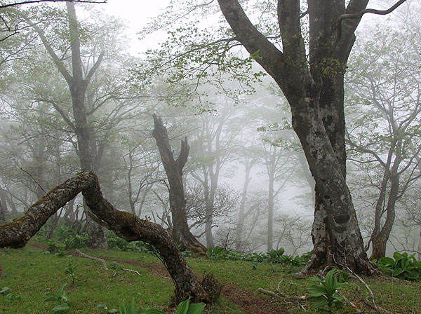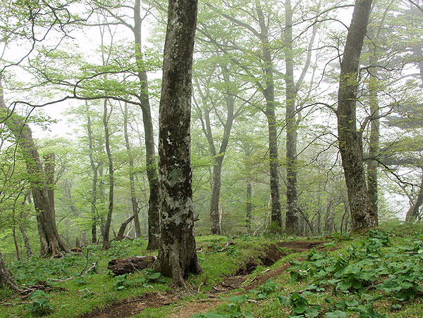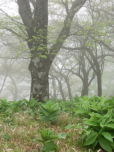 丹沢山 ('04-05-12歩く) 塩水林道から堂平ブナ林を通って丹沢三峰尾根にでて丹沢山へ登り、帰りは天王寺尾根をくだった。 丹沢三峰尾根はシロヤシオが満開でした。丹沢山付近はシロヤシオはつぼみでしたが、ガスってコバイケソウの新芽とブナ林 が幻想的でした。 天王寺尾根は堂平分岐付近のシロヤシオが満開でした。下にくだって杉の植林帯に入る手前の自然林では コバノガマズミの花が咲いていました。本谷川林道ではフジの花、ハルユキノシタが花盛りでした。 なお、 ブナ林から丹沢三峰尾根に抜ける道は道標もなく迷いやすくまだ把握しつくしていませんのでコースガイドは省略しました。 ●コースタイム('04-05-12) 塩水橋7:10〜15--塩水林道終点(堂平)8:53〜9:00--ブナ林入口9:25〜30--丹沢三峰尾根10:45--丹沢山11:55〜12:20-- 堂平分岐13:05--塩水橋60分赤い道標13:50---本谷川林道14:45--塩水橋15:25 ●写真 ![]() 本谷川の渓流とフジ ![]() 塩水林道のウツギと山ツツジ ![]() 塩水林道のホウの花 ![]() 堂平の杉林 ![]() 堂平のブナ林 ![]() 丹沢三峰尾根のシロヤシオ ![]() 丹沢三峰尾根のシロヤシオ ![]() 丹沢三峰尾根のシロヤシオ ![]() 丹沢三峰尾根のヤマウツボ ![]() 丹沢山頂付近のブナ林 ![]() 丹沢山頂付近のブナ林 ![]() 丹沢山頂付近のマメザクラ これより丹沢山より下る ![]() 天王寺尾根へ下る木道 ![]() 同上付近のブナに絡んだつた ![]() 天王寺尾根のブナ林 ![]() 堂平分岐のシロヤシオ ![]() 天王寺尾根のギンリョウソウ ![]() 天王寺尾根のコバノガマズミ ![]() 本谷川林道のハルユキノシタ ![]() 本谷川林道のフジと新緑 ![]() 本谷川の清流 < カメデアE-20にて撮影 > |