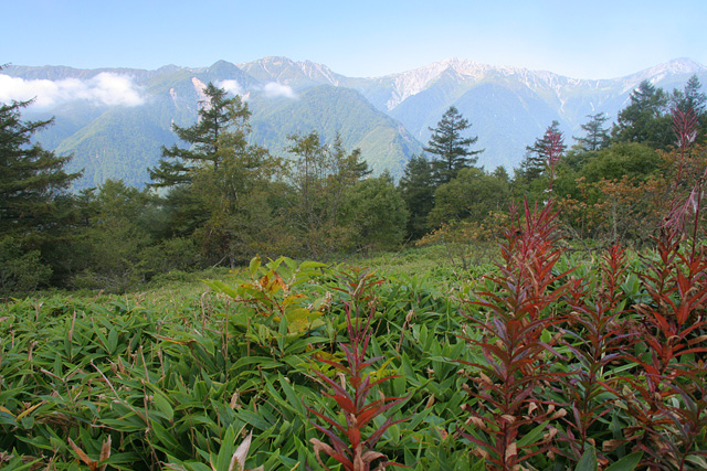 が目に飛び込んでくる。手前には花の過ぎたヤナギランが立ち、その先にはコメツガであろうか黒木がシルエットで前景を飾っている。盟主の北岳は一番右側で木に遮られて少し窮屈に見える。青空に輝く白銀の嶺々とは行かないが