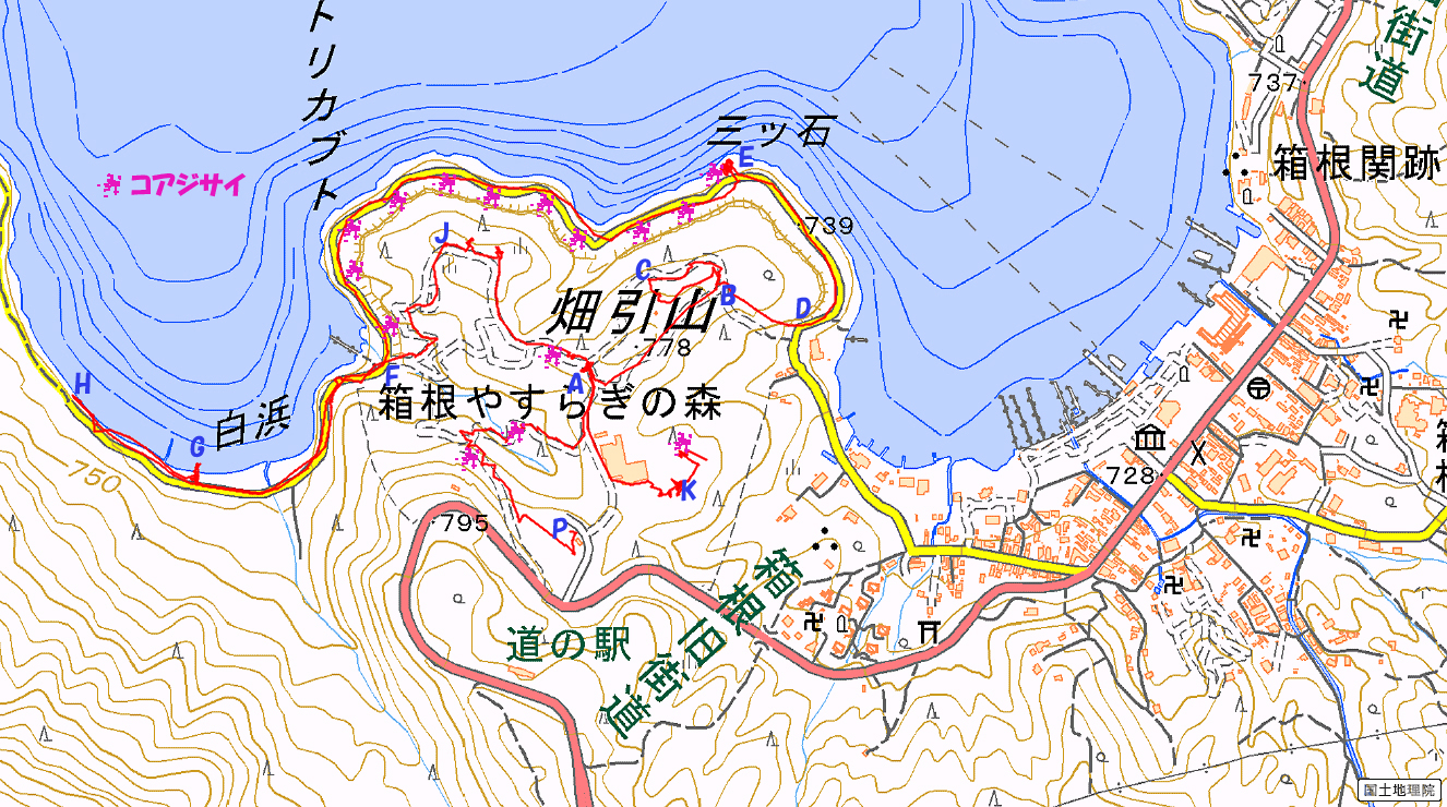 歩いた順路はmap1の次のコースである。 P→A→B→C(東屋)→D→E(三ッ石)→F→H→G→F→J→A→K→P