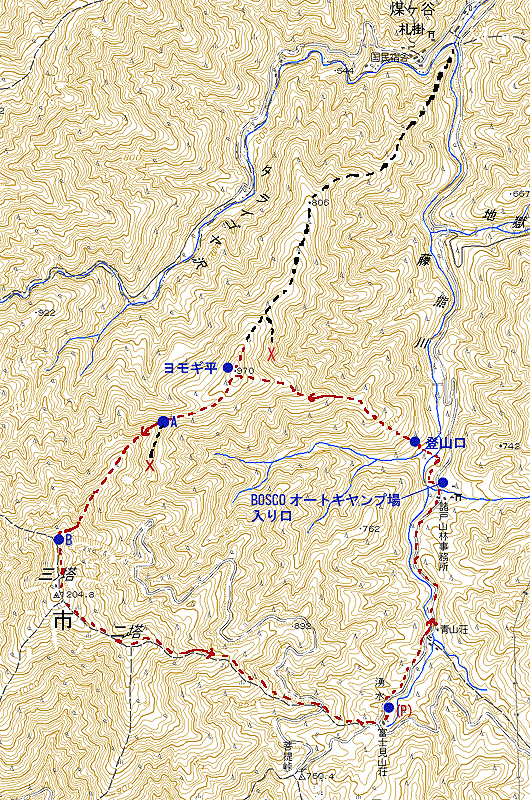 札掛からヨモギ平('06-03-15歩く) 昨年の4/15、諸戸からヨモギ平〜三ノ塔と歩いた。今回はヨモギ平のケヤキの木の写真をじっくり写そうと、まだ歩いていない 札掛〜ヨモギ平のコースで登り、諸戸のBOSCOオートキャンプ場に降り、県道を札掛に戻ることで計画した。 札掛の「札掛森の家」 の50m位手前の左側の駐車場に車を置いて、札掛森の家の横を通って吊橋の下の藤熊川とタライ小屋沢の合流点に下る。 ヨモギ平に行くには沢を渡って向かいの尾根に取り付かねばならない。しかし、吊橋付近は雪解けのせいか水量が多く、渡れそ うない。徒渉点を探してタライ小屋沢の上流の方に向う。丹沢ホームの下あたりでようやく徒渉点を見つけて渡り、対岸を吊橋の方に戻 る。 さて、どこから尾根に取り付くのかと探すと、「保安林」という黄色い立札の傍に踏み跡がある。それに沿って上がる。 そのうち裏側に回り込んで行ってしまうようであるので、立ち止まって確認する。右上を見ると上に登る踏み跡がある。それに取り付き、尾根に乗る。そこからは明瞭な 尾根道である。 結構、背の高い太い杉並木の尾根道である。杉林というと陰鬱な感じを受けるが明るく気分が滅入ることは 無い。その代り、風通しが良く、冷たい風で手がかじかんで来て手袋をして登る。この尾根は地形図で見るとおり、等高線が込み合っては 広がる、というパターンの繰り返しである。ということは勾配がきつくなって疲れた頃、フラットになる、ということで極めて登りやすい 道である。そして途中から赤テープが道案内してくれる。 何回か登りとフラットを繰りかえして30分ほど登ると、少し痩せた尾根になり、 目の前に露出した木の根の張り出したステップが立ちはだかる。迂回の道はないのかと左右みて赤テープを探すが無い。 これは根っこを乗り越えることだと解釈し、乗り越えると傾斜もゆるみ、赤テープの巻き付けられた3本の柱の立つピークに達する。 ここから少し下って再度登りにかかる。相変らず杉並木の尾根道である。12,3分も登ると初めて明るくなりミズナラの大木の立つところとなる。 しかし、すぐまた杉並木の尾根道となり、5分ほど登ると自然林のピークに達し、赤テープが2本ほどぶら下がっている。 ここより根っこの露出した少し痩せた尾根を登って行くと前方が開けて雪と枯れ草で覆われた台地が上に見えてくる。 平坦な台地に立つと右側の冬木立の向こうに長尾尾根が長く横たわり、ヨモギ平に似た雰囲気である。そろそろヨモギ平と思う。 雪の草地にはテンニンソウのドライフラワーが一面広がっている。そして一筋の道がずっと先の桧の疎林の中に消えて行っている。 これは桧だろうか、まるでクリスマスツリーを飾るもみの木のように三角の樹形である。 桧の疎林を抜けるとヨモギ平か、と軽やかな気分で歩いていたところ、また杉林に入る。がっかりである。少し行くと登りとなり、二又に分かれている。正面の道は荒れている。左のピークを迂回するような道の方がいい道で迂回するなら 楽でいい、と左に行く。しかし、巻くもののいつまでたっても上に上がらず下り気味である。これは間違いと思って引き返す。 分岐点に行ってよ〜く見たら真っ直ぐ行く方に赤テープがある。最初は木に隠れて赤テープが見えなかったようである。ここは要注意 である。 薄暗い杉林だし、道は間違うし、滅入って登っていったところ、思いがけず右手にブナの巨木に近い大木が現われる。 杉林のため南側からの日は当たらないと思われるが、良くぞ生き永らえてきたものだと感心する。ブナに元気をもらってさらに上って行くと金網の柵が見えてきて、その向こうには あの見覚えのあるテンニンソウのドライフラワーで一面覆われた明るい草地にケヤキの大木の立つ美しい風景が展開している。 写真を写し写しのんびりと上って行くとピークに達し、そして、その直ぐ下に見えるベンチがありヨモギ平の道標の立つ諸戸と三ノ塔の分岐点に下ってゆく。 ここにザックを置いて右斜め下に展開する美しいケヤキの台地を写真を写しながら散策することにする。 左手には大山、正面には三ノ塔、右手には長尾尾根・・と、ヨモギ平をとり囲むように横たわっている。その広々と周囲の山に囲まれたヨモギ平の 空には久しぶりに澄み切った青空が広がり、その左上からやわらかい春の日差しが注ぎこんできている。そして、なだらかな台地一面に広がるテンニンソウのベージュ色のドライフラワーは 温かい空気を漂わせ、 空に広がるケヤキの梢は輝き、野鳥たちは囀っている。 一廻りした後、ベンチに戻り昼食とした。 そして、諸戸へブナの木を見上げたり、大山を眺めたりしながらのんびりと下った。県道に出てからは札掛まで約50分である。車道歩きは退屈なので、途中、地獄沢橋でミツマタの群生地に 寄って写真を写して気分転換し、残りの札掛までを歩いて、この山歩きを無事終えた。なお、ミツマタは