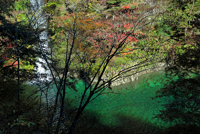 このダムを過ぎると、次々とトンネルが現れる。その間は、渓流が金色に染まり、山肌の紅葉も美しくなり、今まで知らなかった滝も現れたりする。