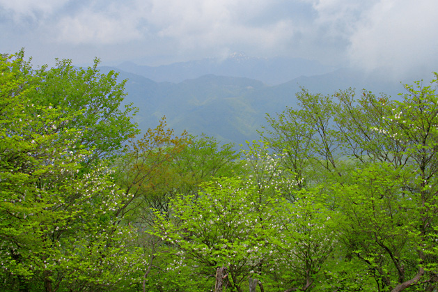 息切れし、肩のような所で一息入れて、また急登してゆく。徐々にシロヤシオが多くなり、満開のロヤシオに囲まれながら登る。下のほうはミツバツツジは終わっていたが、登ってくるとピンクのミツバツツジも見られるようになる。やがて、右背後に日光の山々が見えてくると